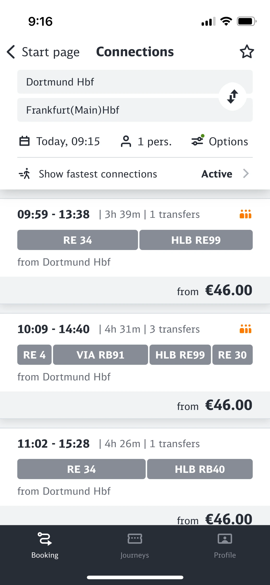 이번 여행 마지막 도시는 오랜기간 체류해서 잘 아는 프랑크푸르트로 정했다. 익숙한 공간에서 여유있는 시간을 보내다가 귀국할 생각이다. 시간이 매우 많고 49유로 도이칠란드 티켓을 구입했기때문에 ICE같은 고속열차를 타지 않고 무료로 이용할 수 있는 RE기차를 여러번 갈아타고 이동했다. 독일은 이 기차요금제를 활용하면 저렴한 가격으로 이동권을 확보할 수 있는데 DB Navigator라는 앱에서 필터로 무료로 이용가능한 열차들만 필터해서 찾을 수 있다.