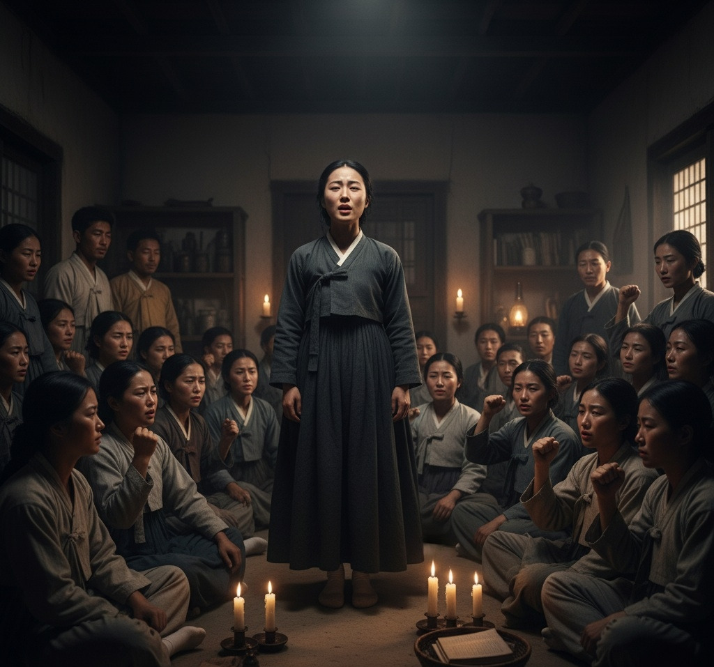 소연은 일본 경찰의 눈을 피해 밤마다 비밀 집회에서 노래를 불렀다.