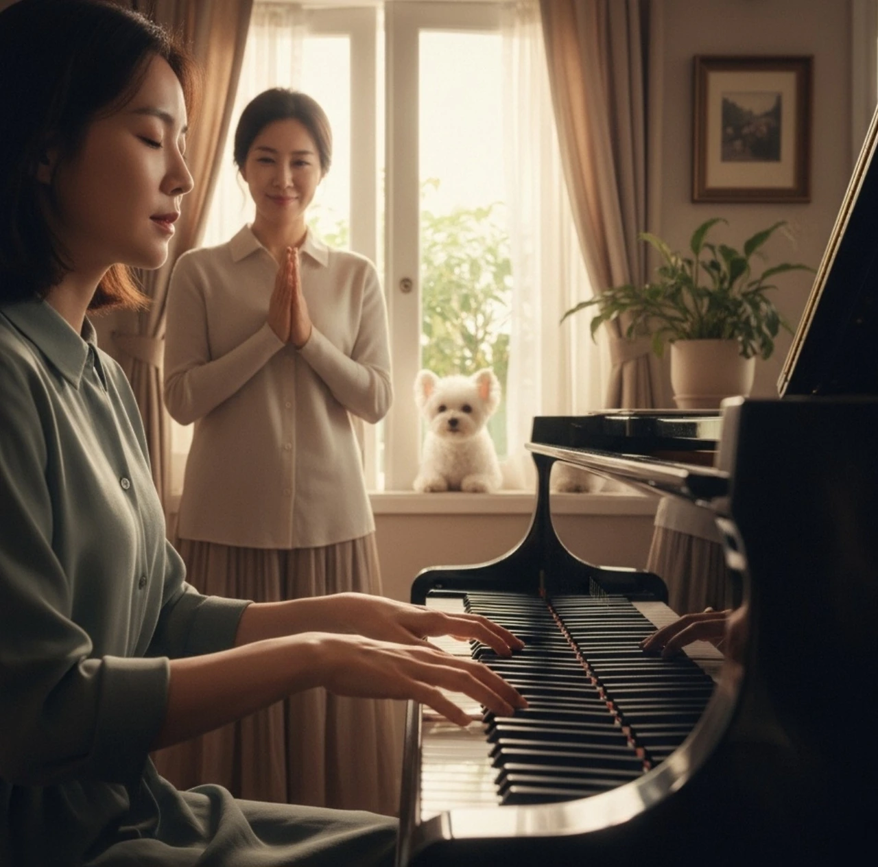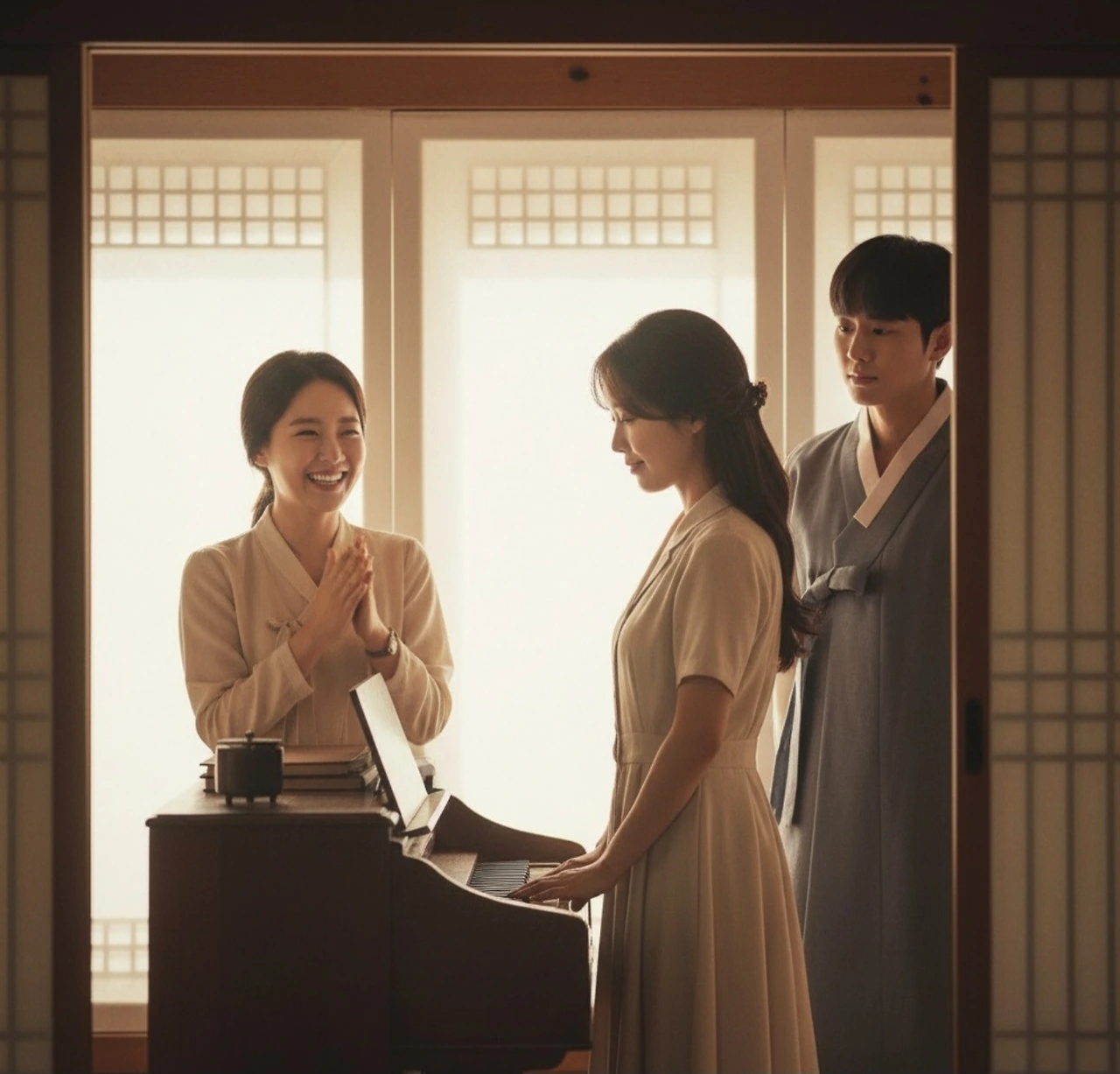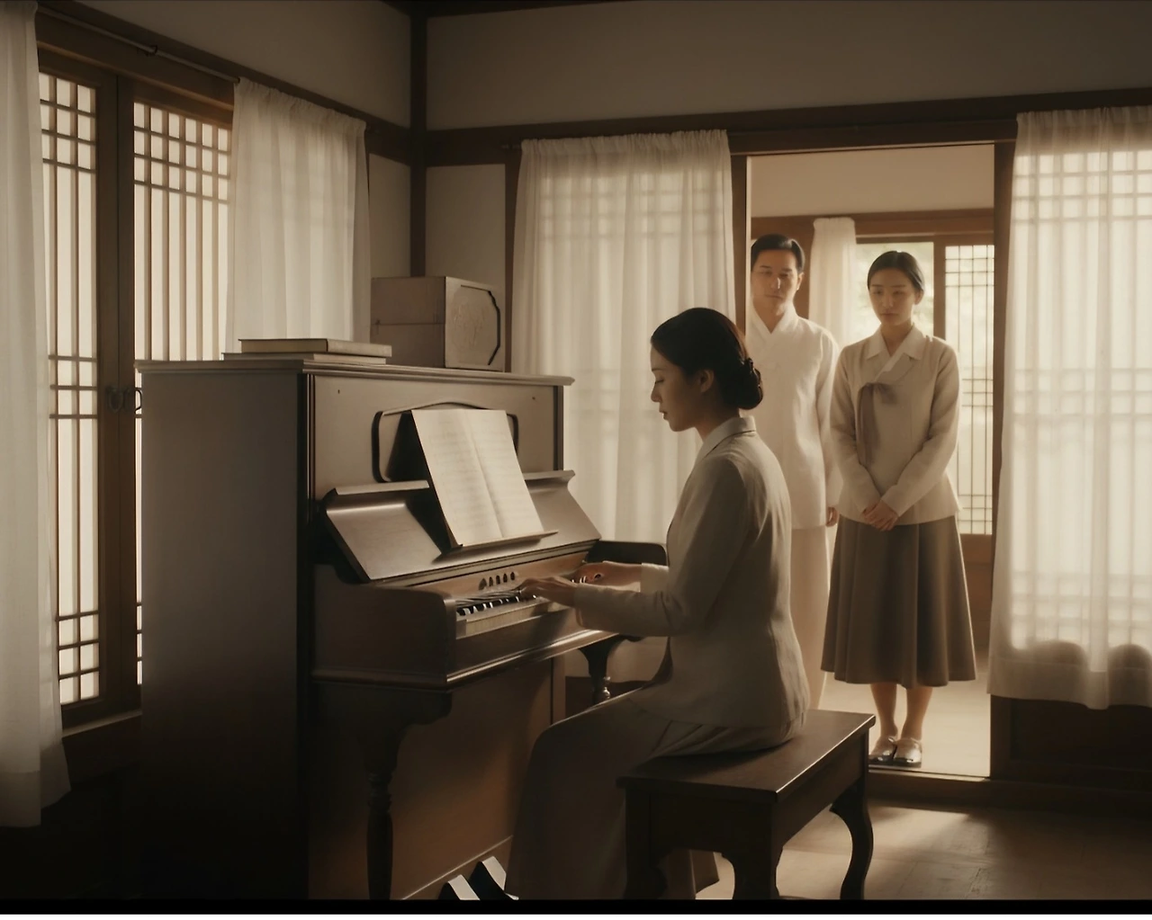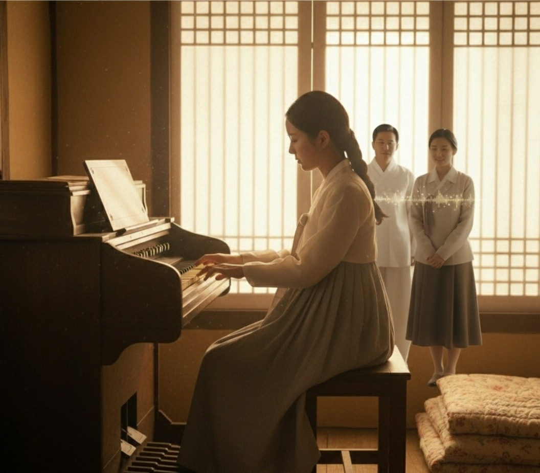 부드럽고 애잔한 선율이 방 안에 흘러나왔다. 이은주는 미소 지으며 듣고 있었고, 막심 이는 문 밖에서 고개를 내밀어 듣고 있었다. 그리고 이산갑은... 대청에 앉아, 눈을 감고 음악을 듣고 있었다.