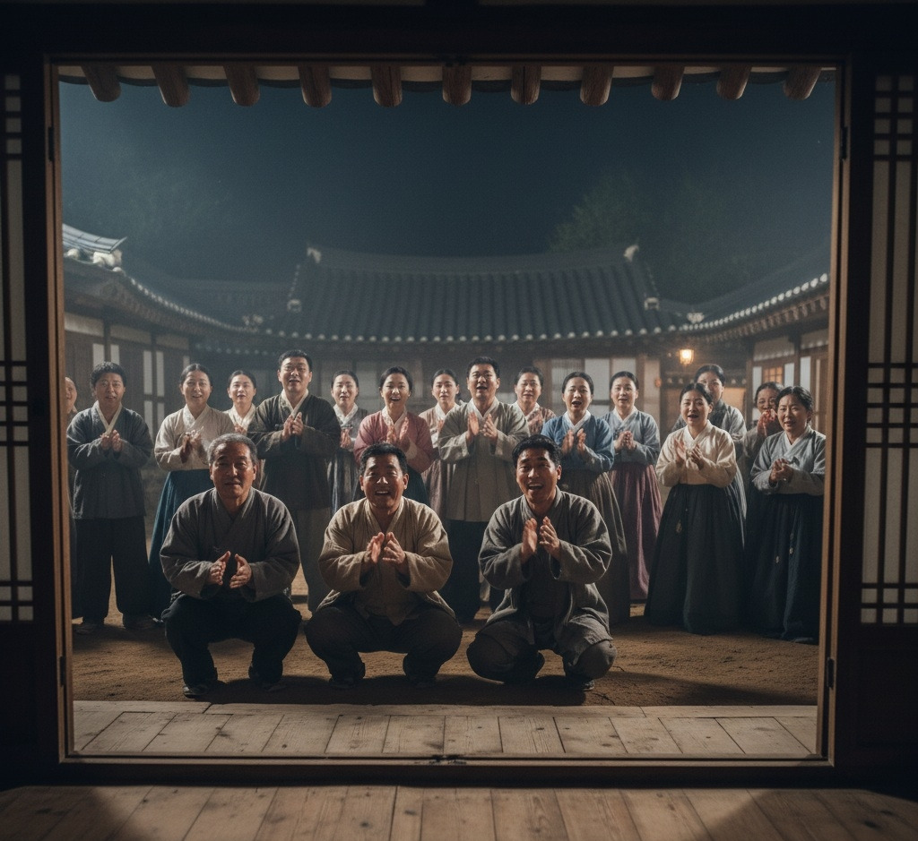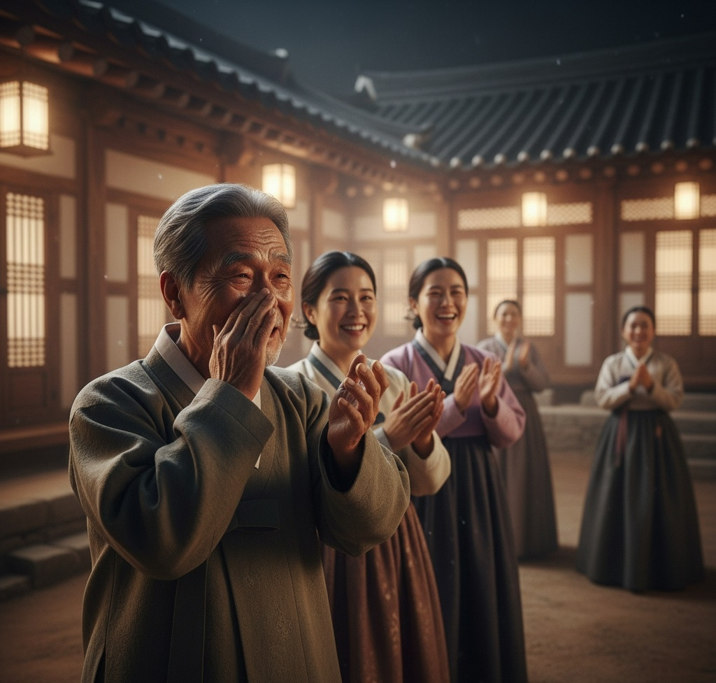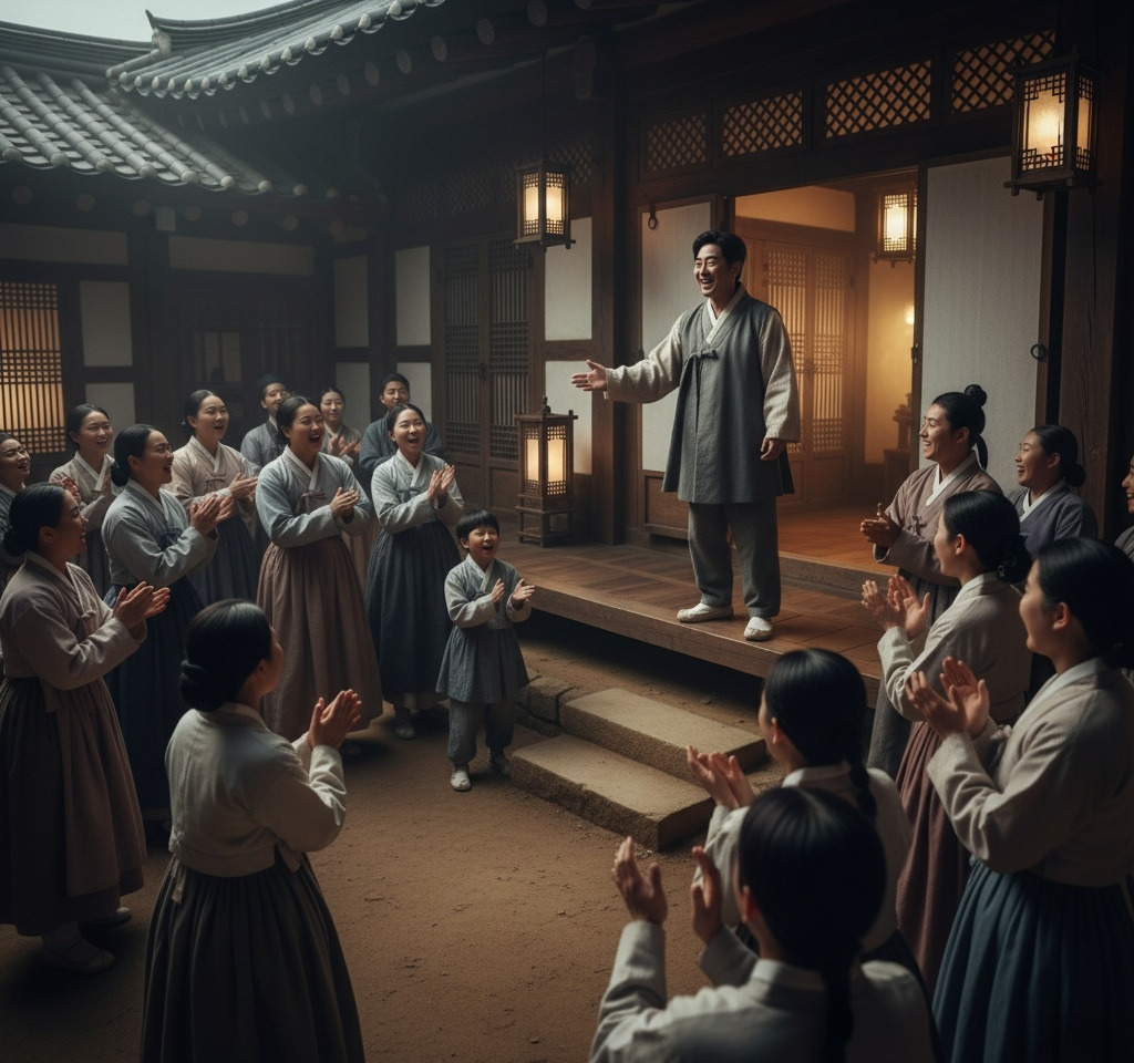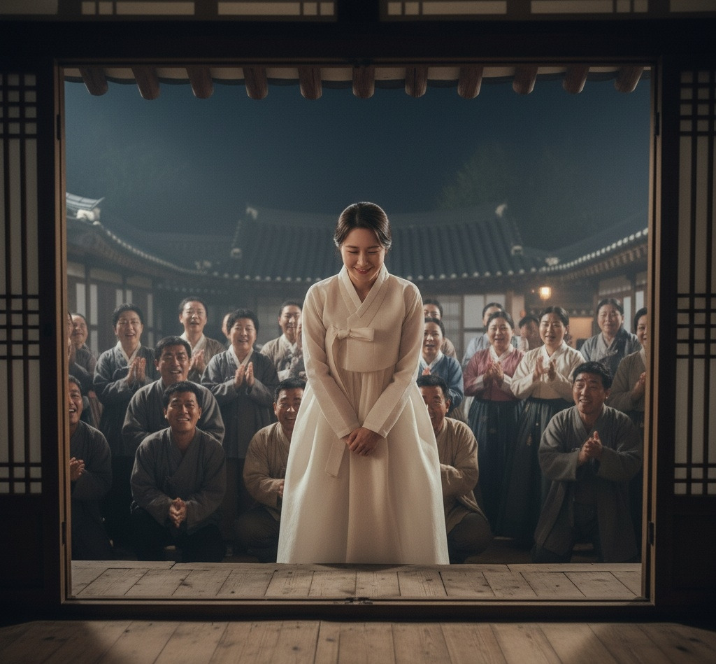 그때였다.대청 밖에서도 박수 소리가 들려왔다. 강지윤이 놀라 고개를 돌리자, 대청 너머 마당에 사람들이 모여 있었다.