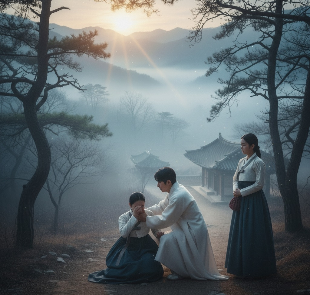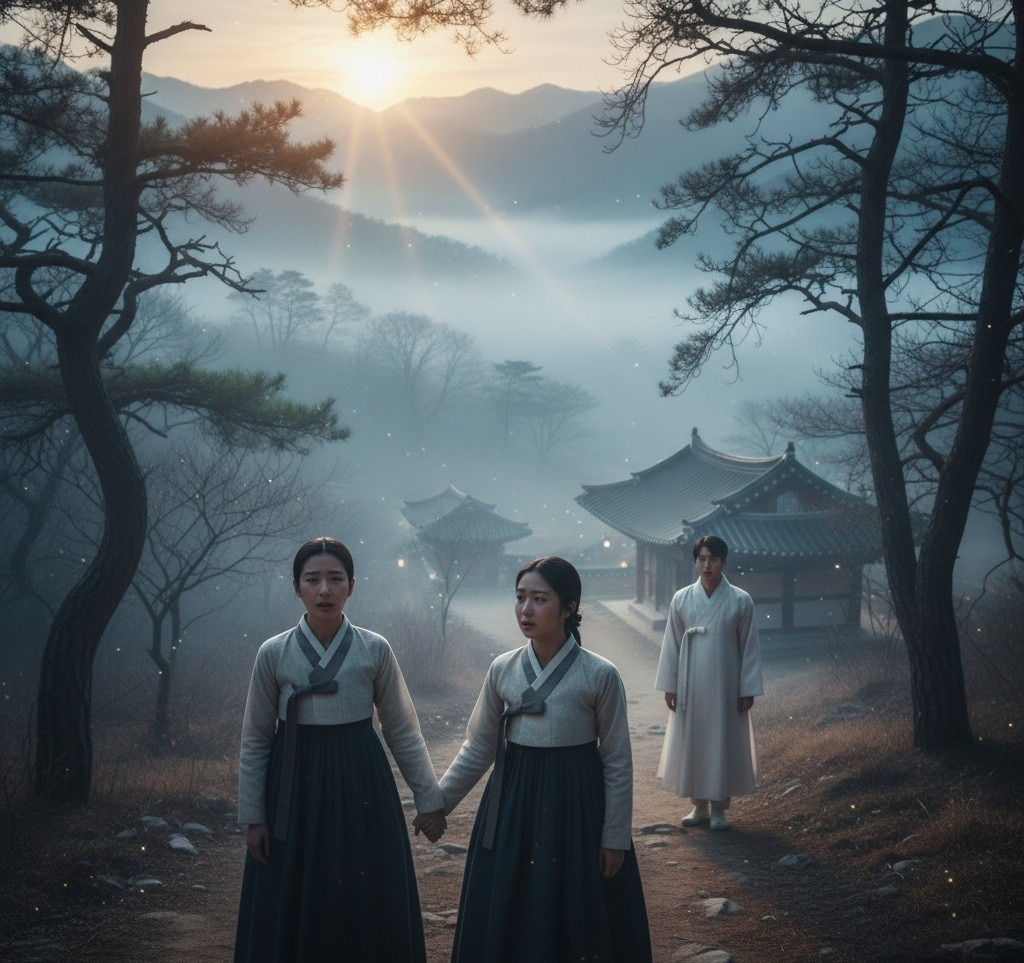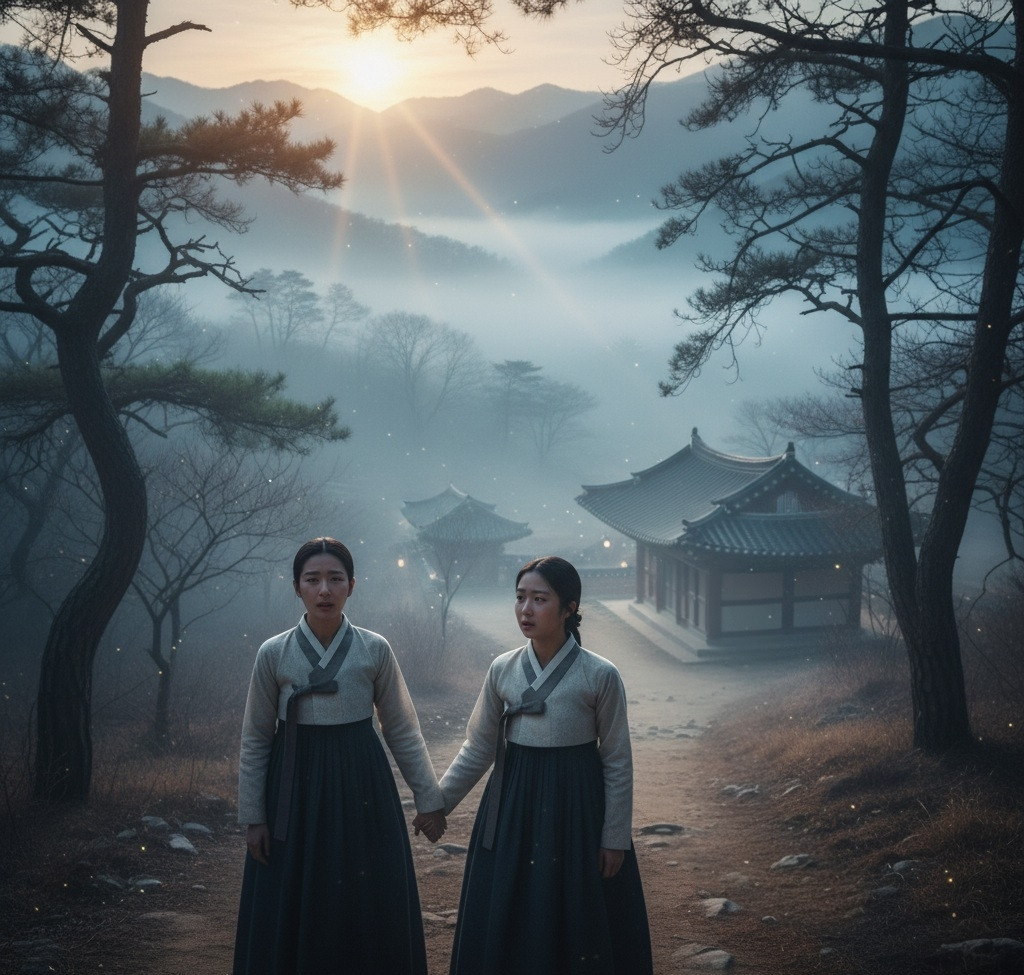 민소진: (앞을 가리키며) "저기요, 아씨! 저기 절이 보여요!"강지윤이 고개를 들자, 산자락 아래 작은 기와집이 보였다. 불갑사 근처의 외갓집이었다.