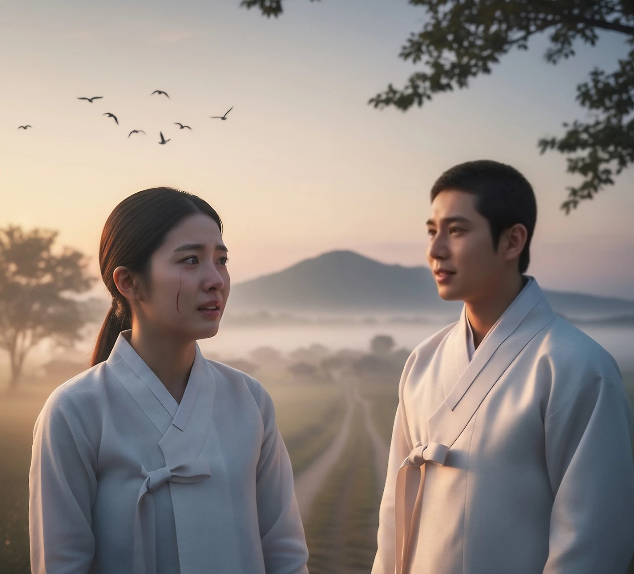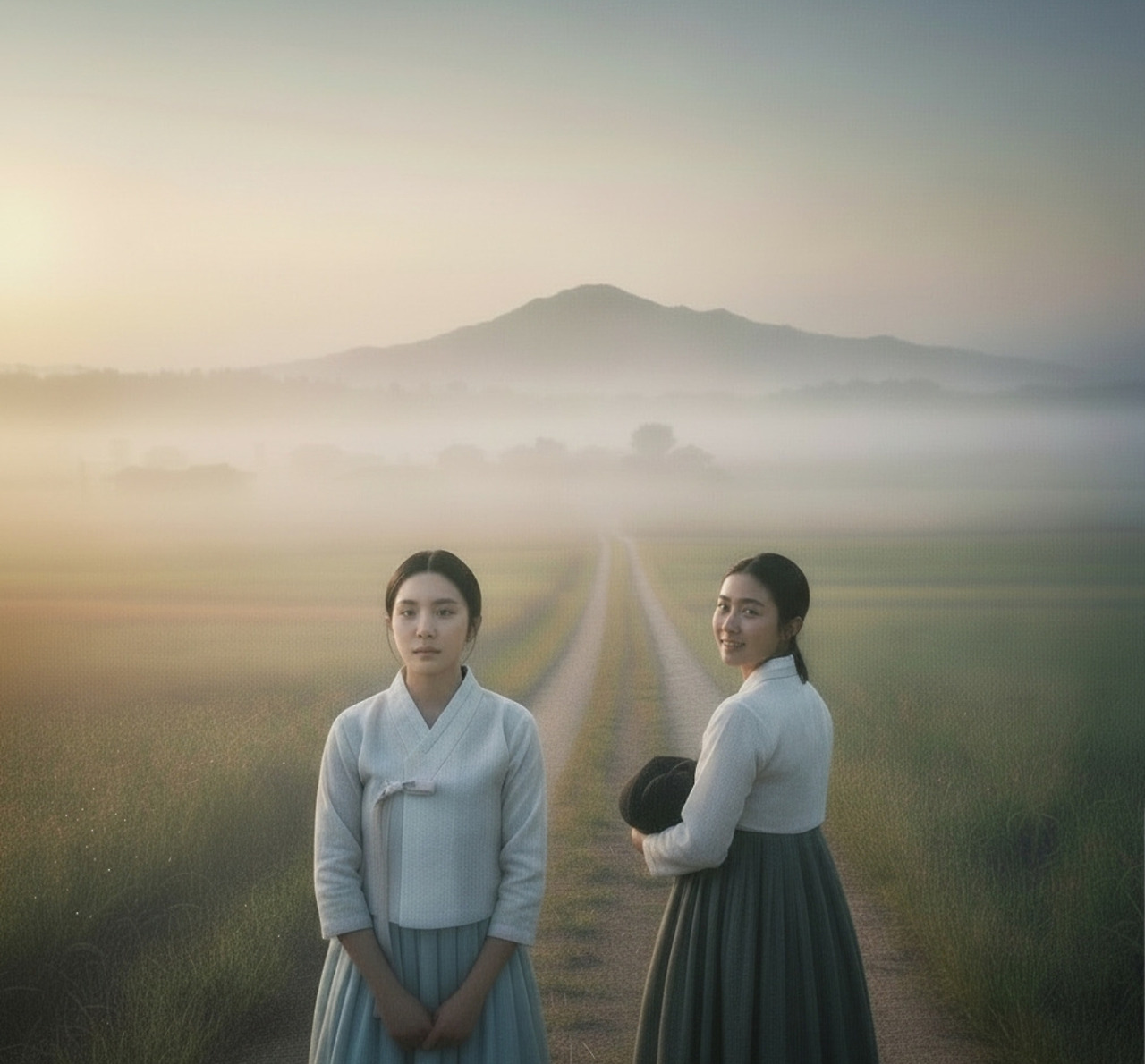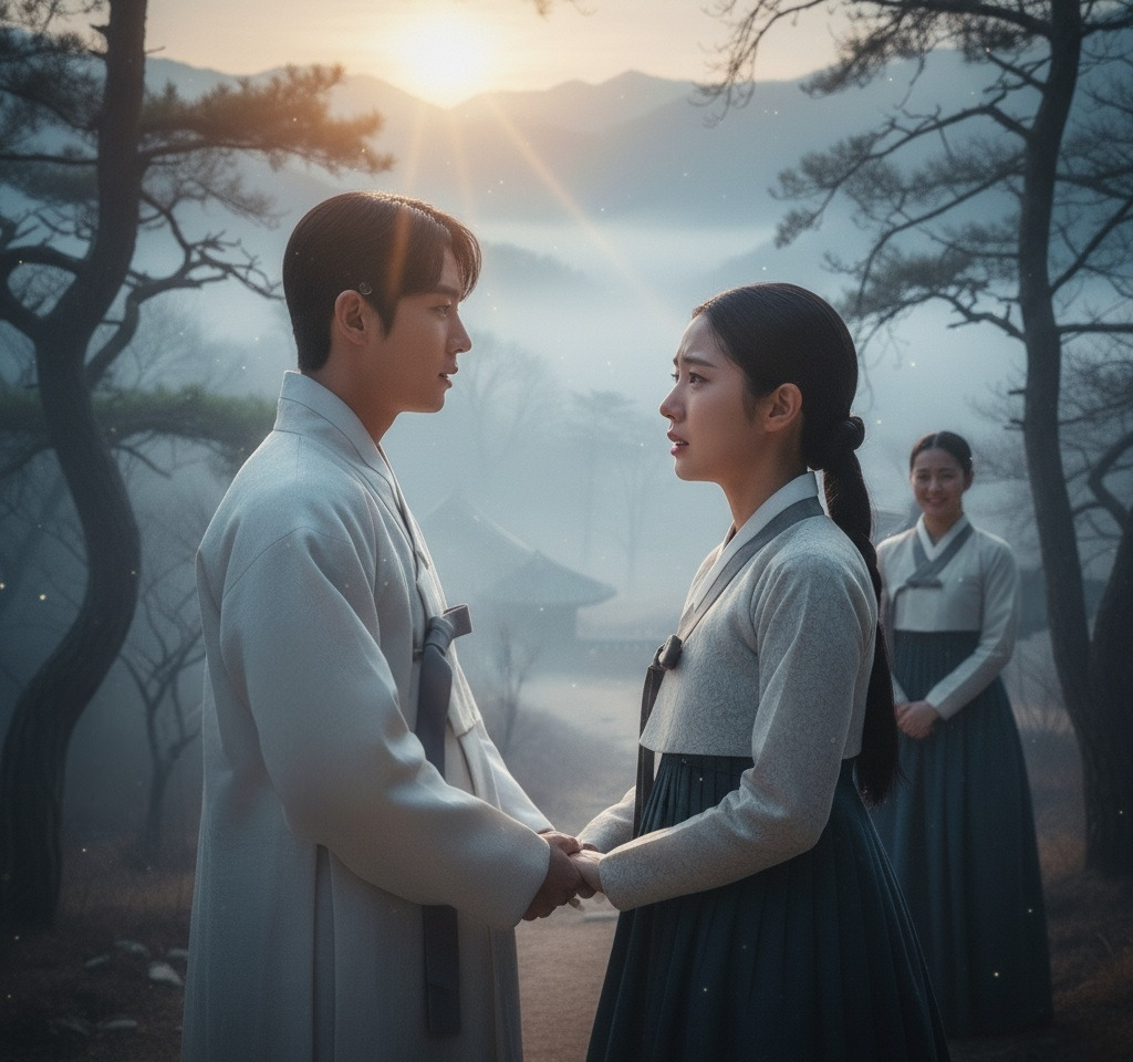 민소진: (앞을 가리키며) "저기요, 아씨! 저기 절이 보여요!"강지윤이 고개를 들자, 산자락 아래 작은 기와집이 보였다. 불갑사 근처의 외갓집이었다.