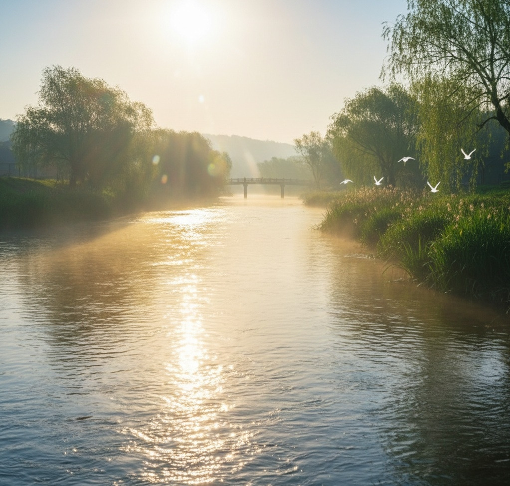 햇빛이 잔잔한 강물에 비치며 반짝였다.