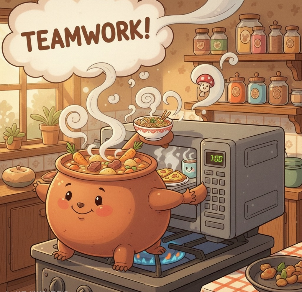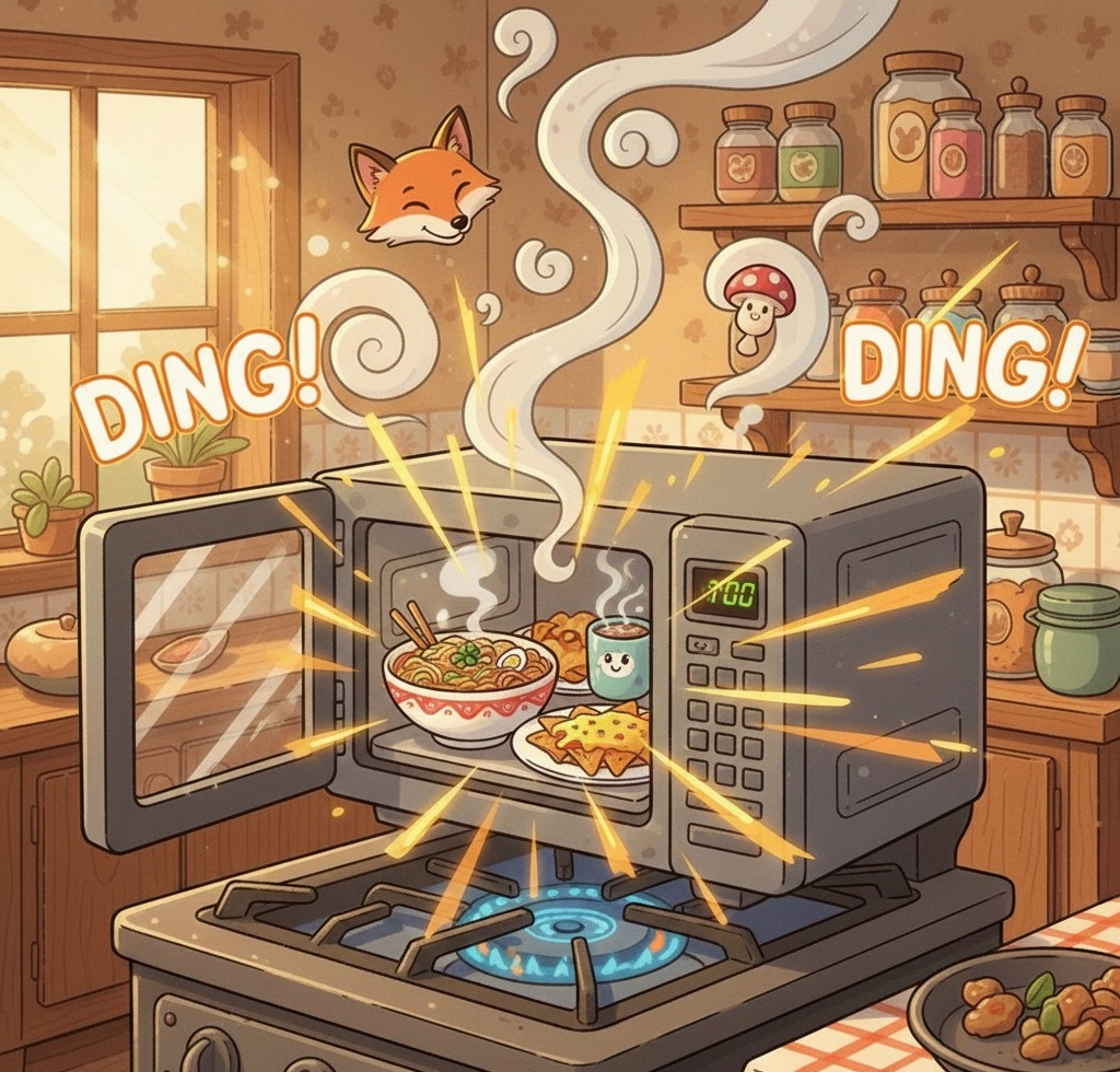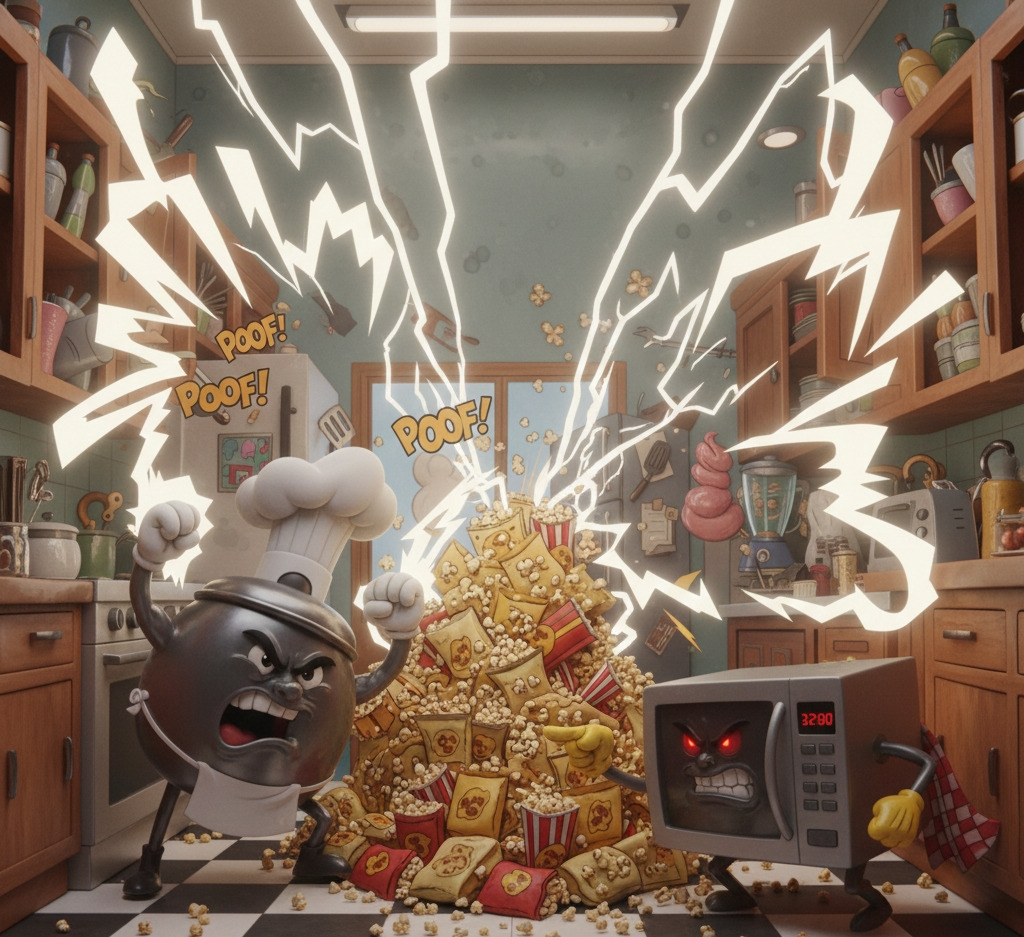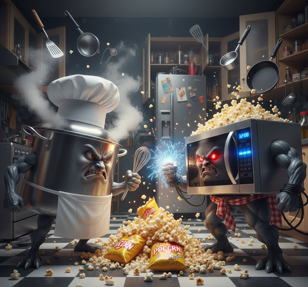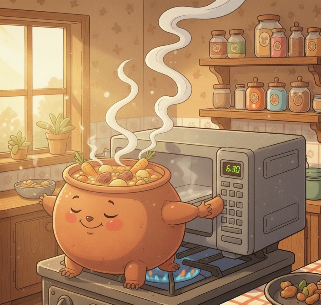 왜냐하면 냄비와 전자레인지, 이 둘은 매일 아침 “누가 주방의 왕인가”를 두고 묘하게 신경전을 벌이기 때문이다.