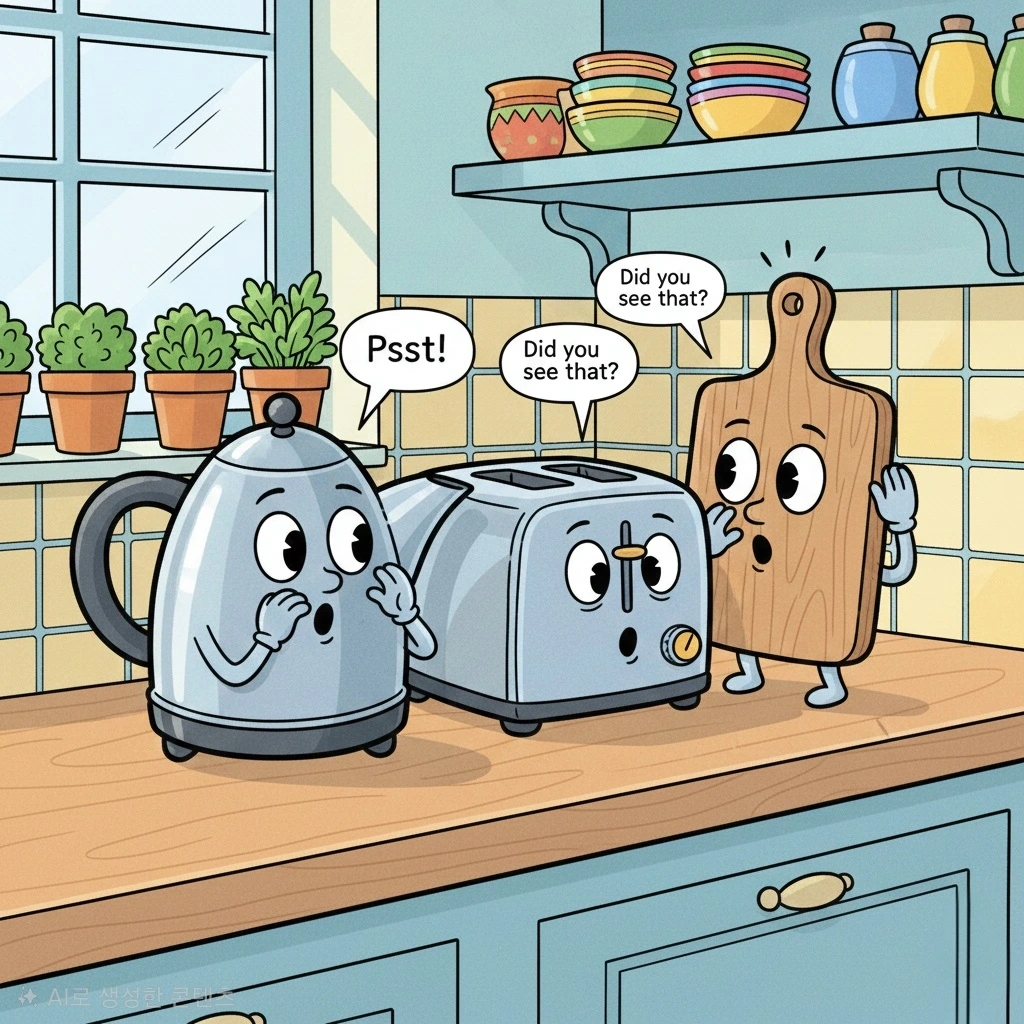 이때 옆에서 주전자와 토스터, 도마가 조용히 웅성거리며 속삭였다.