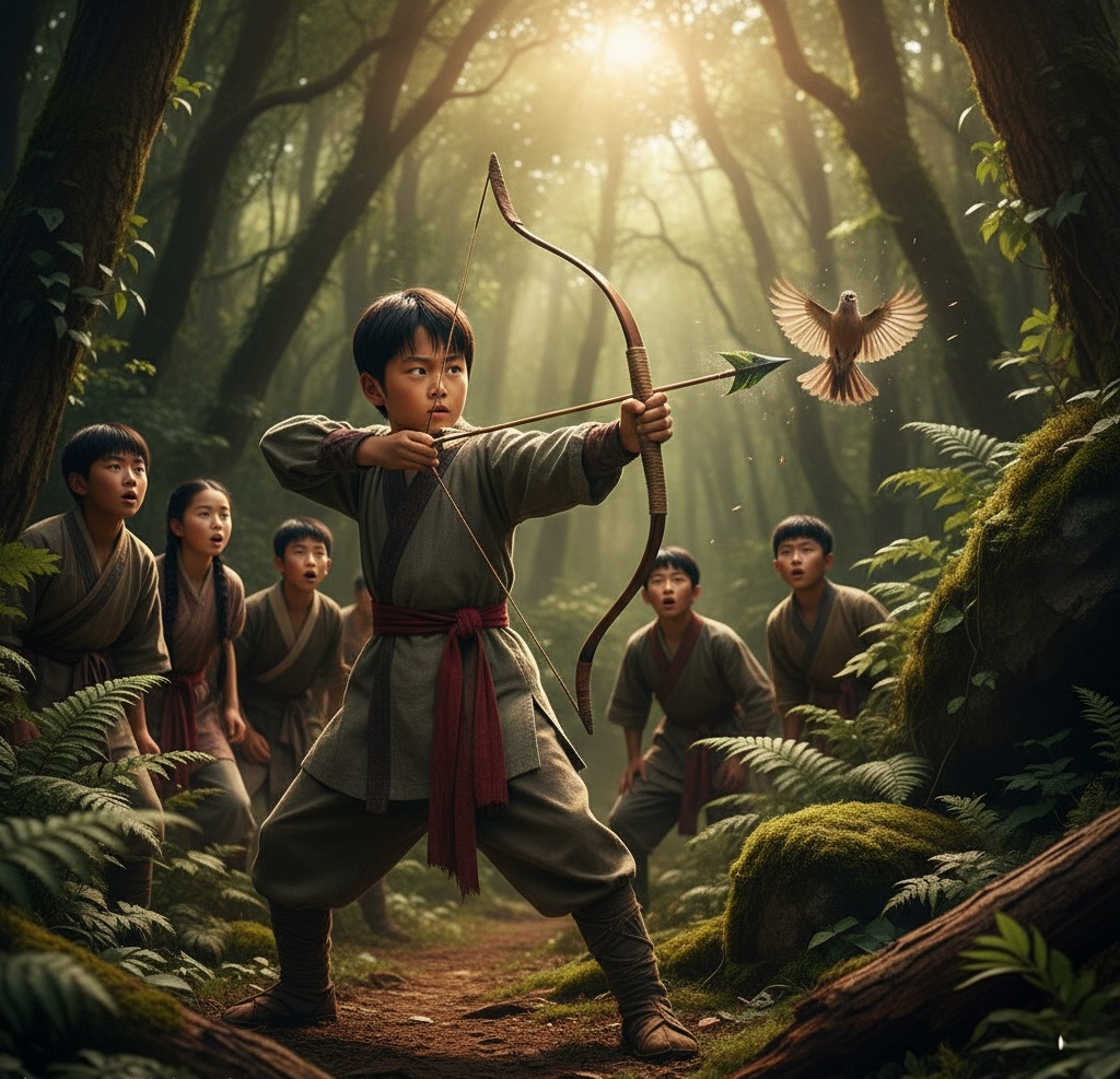 그 아이는 일곱 살에 이미 활과 화살을 스스로 만들어 쏘아 백발백중이었고, 사람들은 그에게