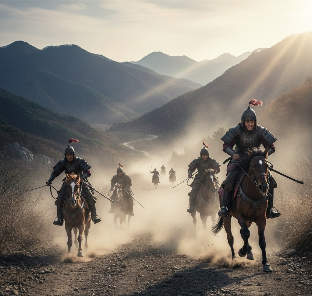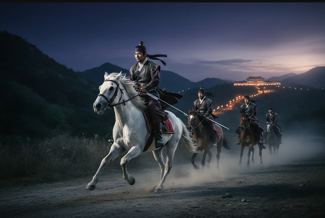 오이, 마리, 협보 등 평생을 함께할 세 명의 벗과 함께 주몽은 어둠을 뚫고 남쪽으로 달렸다. 그들의 뒤에는 부여 왕자들의 추격대가 맹렬히 뒤쫓아오고 있었다.