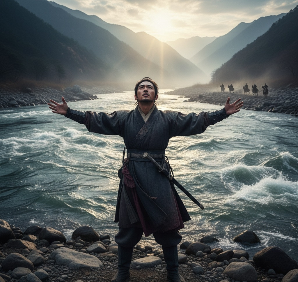 절체절명의 순간, 그들의 앞을 엄리대수(淹利大水), 즉 거대한 강물이 막아섰다. 배도 없이 추격에 몰린 주몽은 하늘의 자손으로서 절규했다.