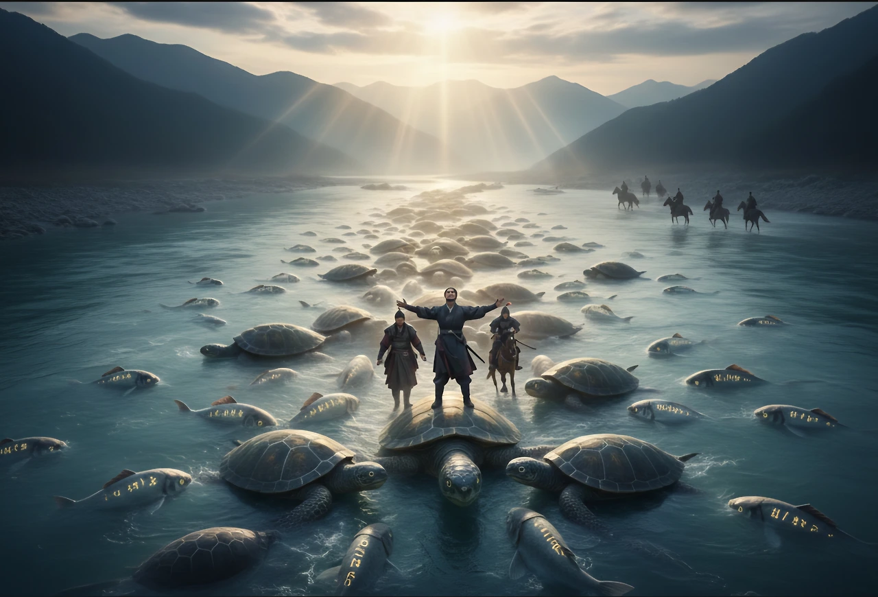 주몽의 외침에 강물은 응답했다. 강에 살던 수많은 물고기(魚)와 자라(鱉)들이 물 위로 떠올라 몸을 이어 붙여 신령스러운 다리(어별연교)를 만들었다.