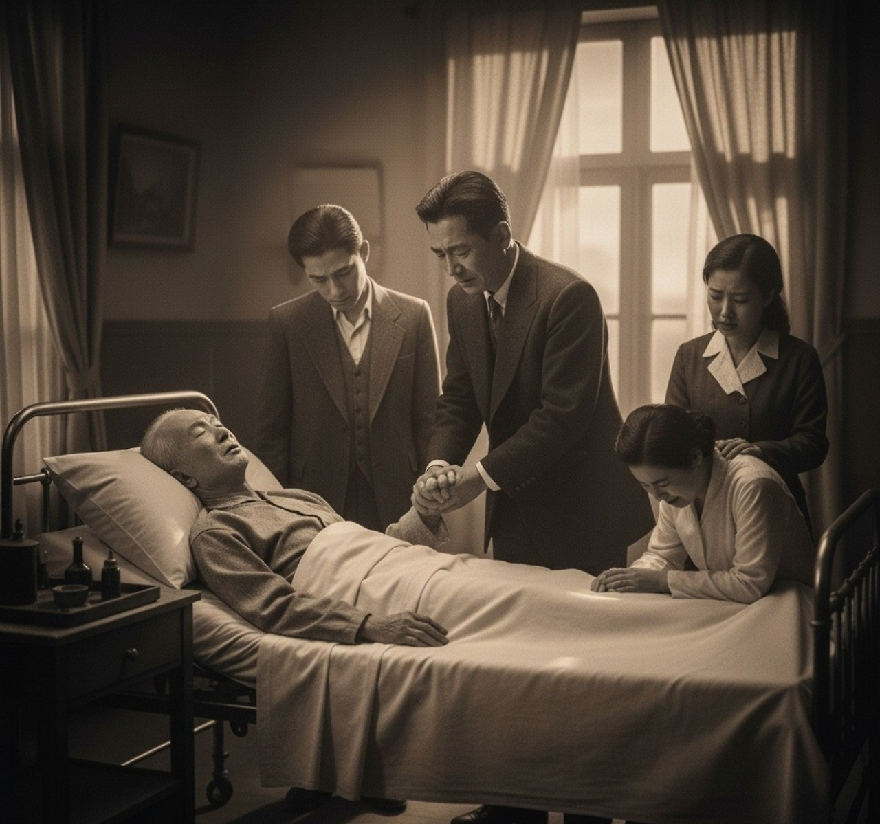 창가에는 딸 박수영이 손수건을 입에 대고 흐느끼고 있었다. 그녀는 아버지를 바라보다가, 다시 창밖을 바라보기를 반복했다. 차마 아버지의 모습을 똑바로 볼 수가 없었다.