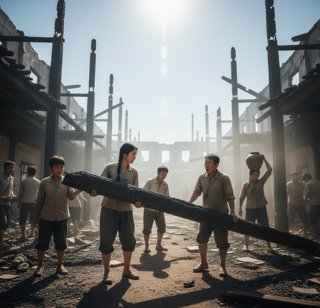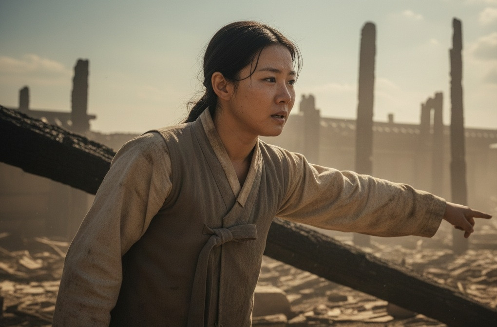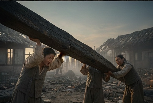 동네 사람이 "네, 선생님!"학당터는 여전히 탄 냄새가 났다. 검게 그을린 기둥들, 무너진 벽, 불에 탄 책들... 윤서영의 죽음 이후 방치되었던 이곳을 다시 일으켜 세우기 위해 사람들이 모여들었다.