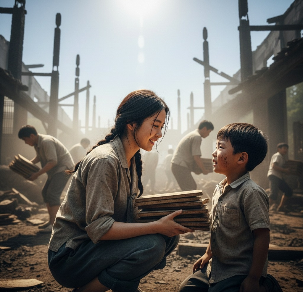 햇볕이 뜨겁게 내리쬐는 여름날 오후였다. 이은주는 소매를 걷어붙이고 불탄 잔해를 치우고 있었다.