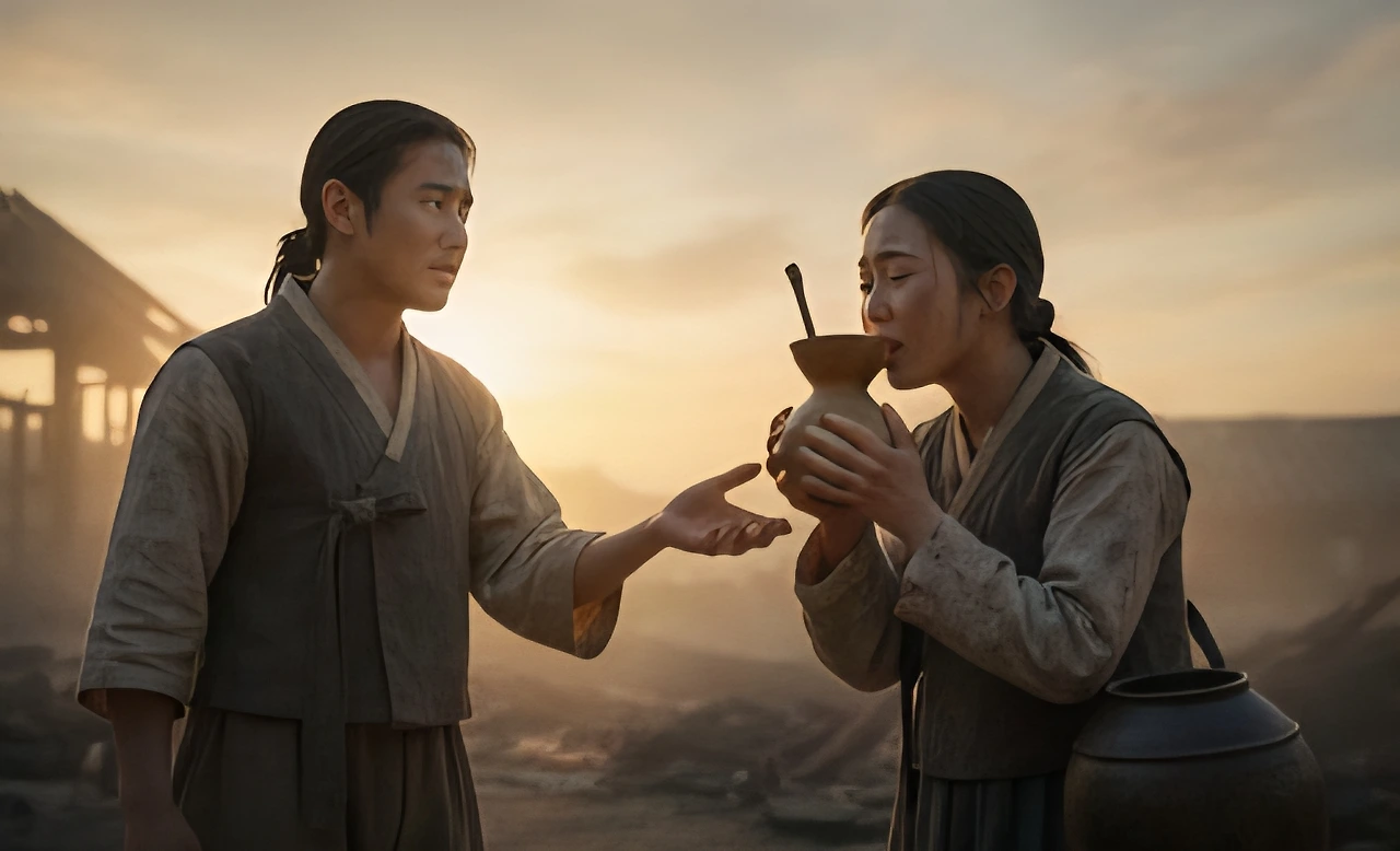 이은주는 물을 받아 마시며 "고마워요, 막심이. 아주머니 다들 고생이 많아요."막심 이는 주변을 둘러보았다. 마을 사람들, 학동들, 그리고 이은주까지... 모두가 땀을 흘리며 일하고 있었다.