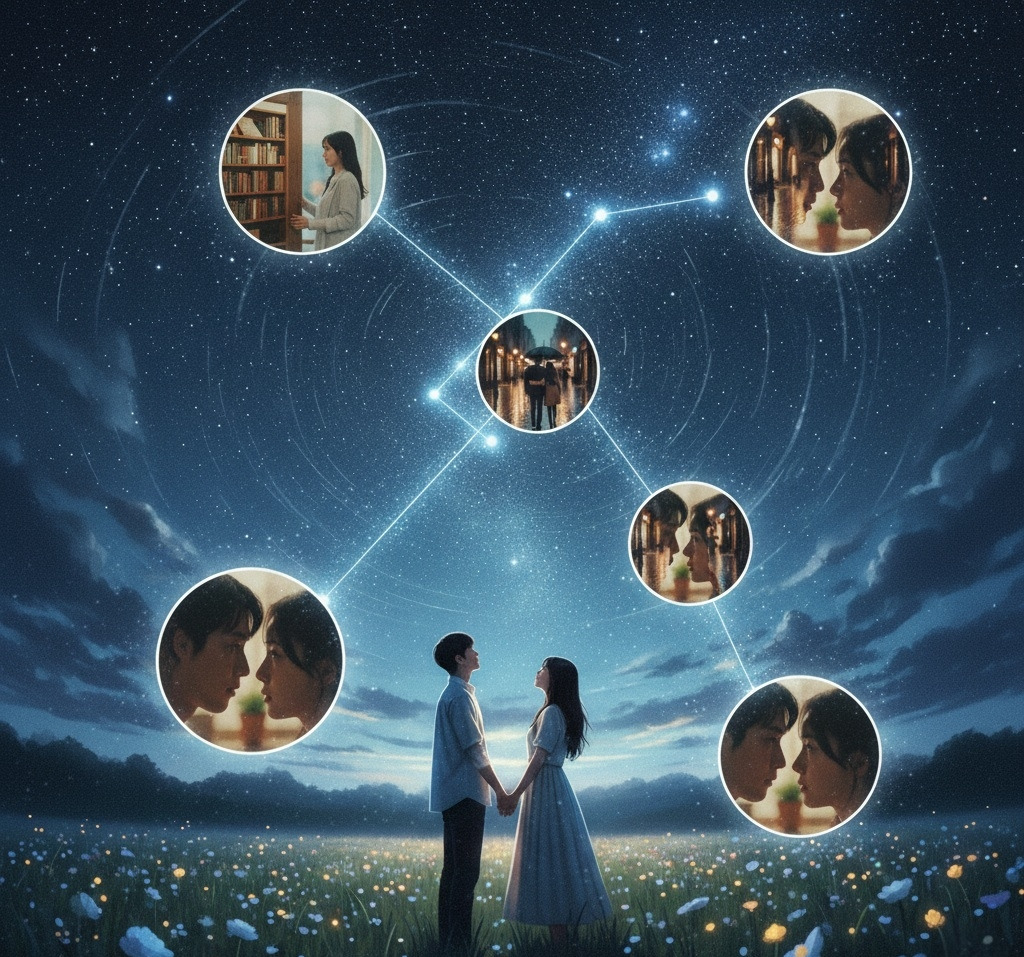 그 별자리를 이루는 별 하나하나가 바로 당신과 나의 소중한 추억들입니다. 처음 만난 서점의 아련한 빛, 함께 걸었던 비 오는 거리의 촉촉함, 서로의 손끝이 닿았던 전율, 그리고 당신의 눈빛 속에서 읽어냈던 말없는 약속들까지. 이 모든 순간들이 모여 우리의 별자리를 더욱 찬란하게 빛내고 있습니다.