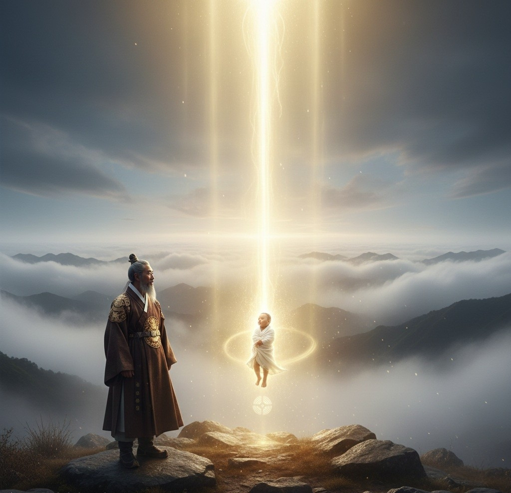 단군의 심장이 격렬하게 울렸다. 그는 숨을 멈추고 빛이 향하는 곳으로 발걸음을 옮겼다. 빛의 중심에는, 놀랍게도 갓 태어난 아이가 있었다. 여인의 품이 아닌, 마치 하늘이 직접 내려준 듯한 신성한 모습이었다. 아이의 작고 여린 몸은 금빛에 둘러싸여 환하게 빛나고 있었고, 그 주변으로는 은은한 광휘가 물결치듯 퍼져나갔다.