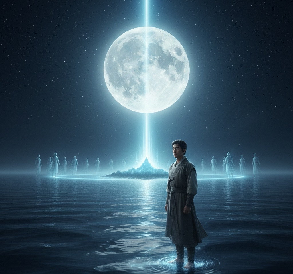 파도가 그의 발아래 부드럽게 부서졌지만, 그는 물에 젖지 않고 마치 단단한 땅을 걷는 듯했다. 멀리 수평선 너머로는 눈부시게 빛나는 섬 하나가 떠올랐다. 그 섬은 마치 세상의 모든 빛을 모아놓은 듯 영롱하게 빛났고, 그 신비로운 광채는 부루의 영혼을 깊이 뒤흔들었다. 그리고 그 빛나는 섬으로부터, 몽환적인 목소리가 그를 불렀다.