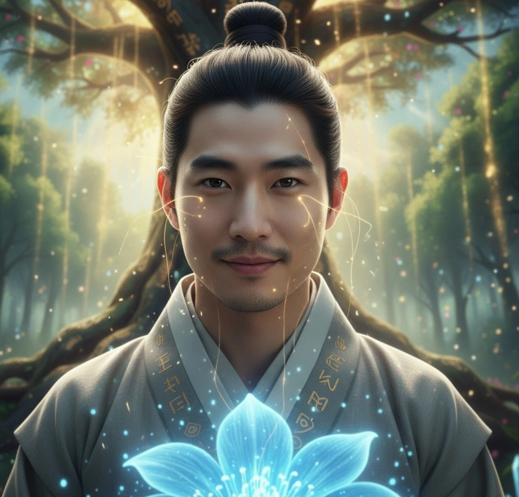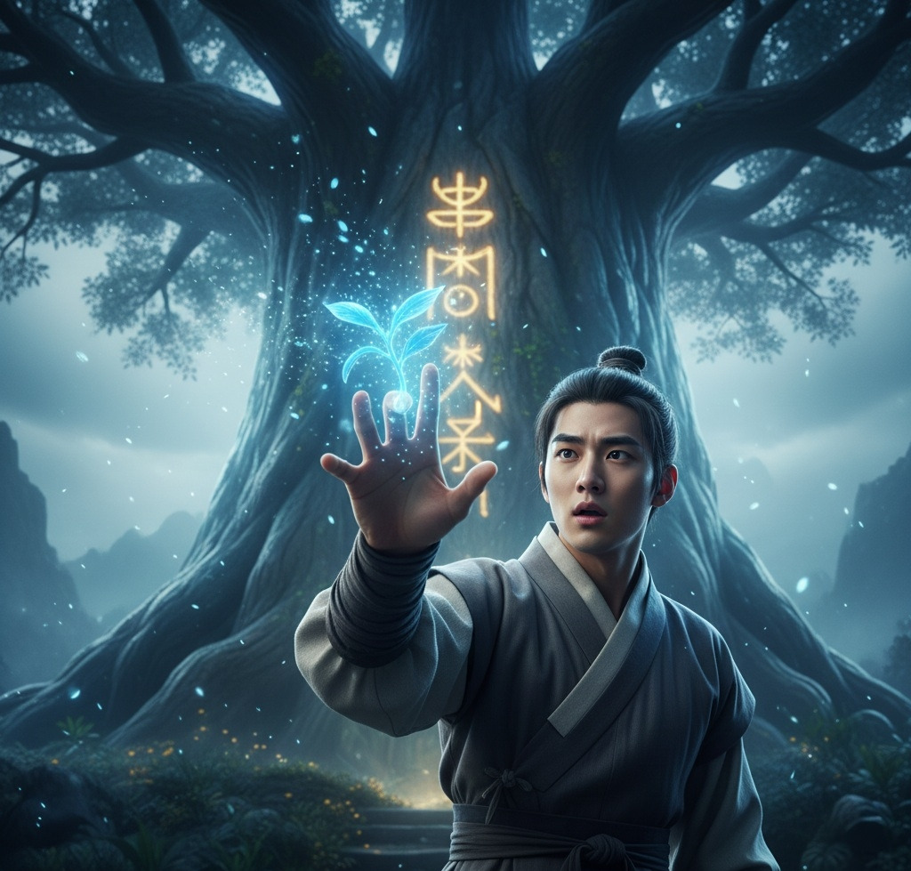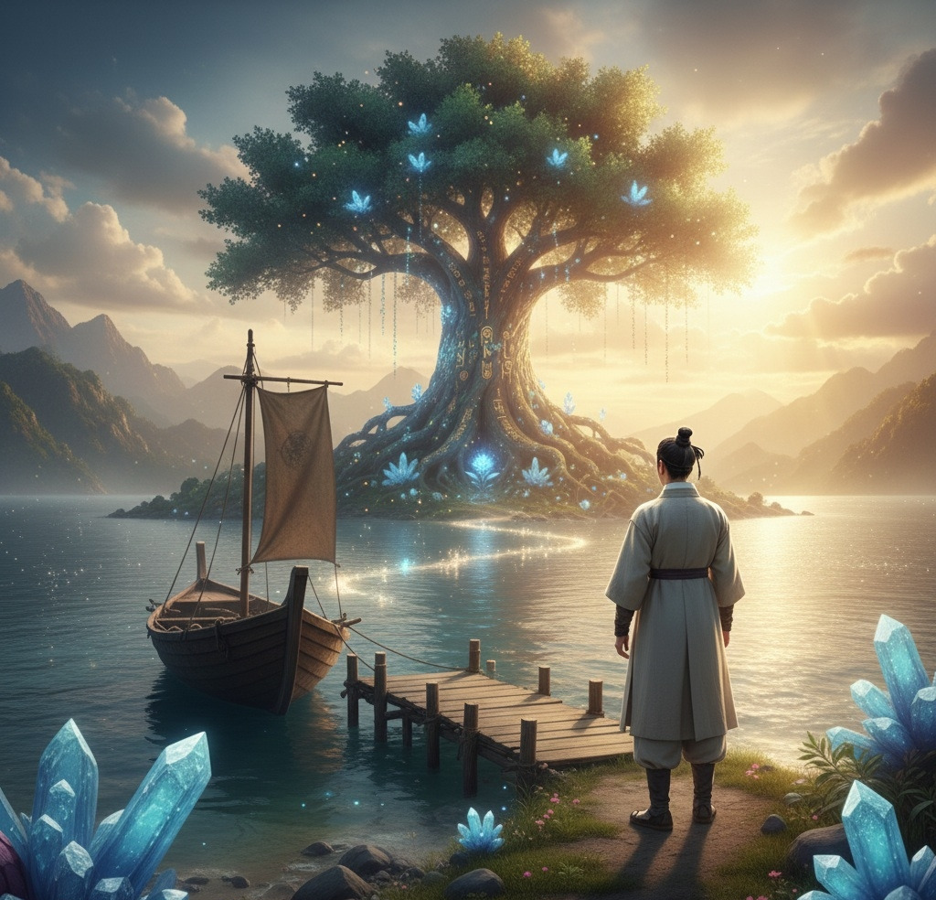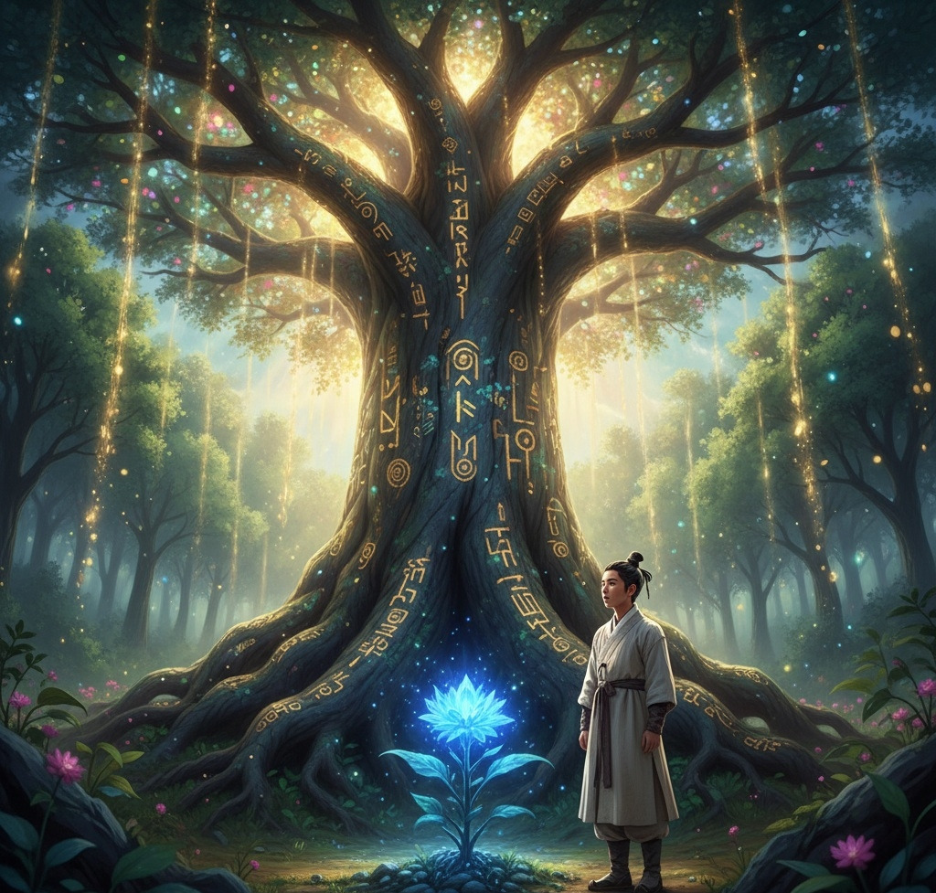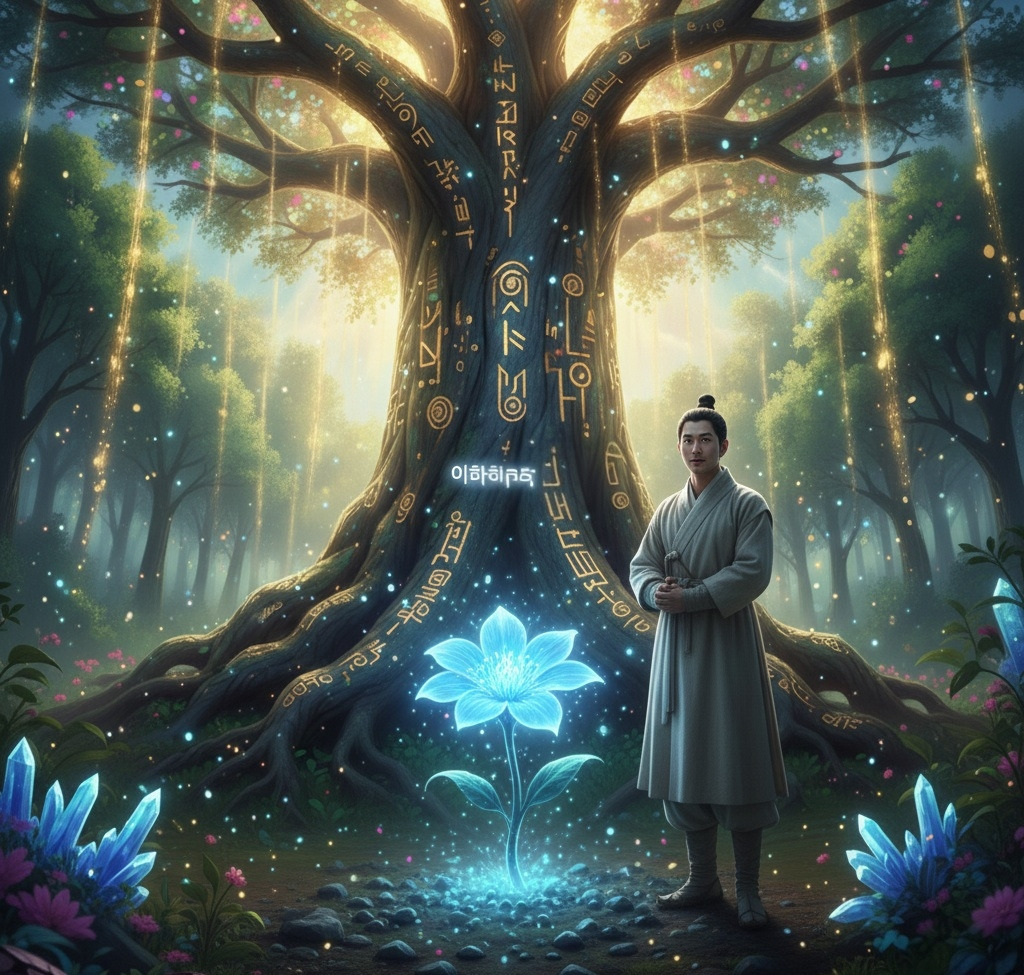 그가 손을 거두자, 아무것도 없던 생명나무 아래 땅에서, 불사초는 마치 처음부터 그곳에 있었던 것처럼 조용히 다시 피어올랐다. 더욱 선명하고 영롱한 푸른빛을 발하며. 약초는 이제 더 이상 손을 뻗어 잡으려 해도 사라지지 않았다. 이해하는 순간, 소유가 필요치 않게 된 것이다.