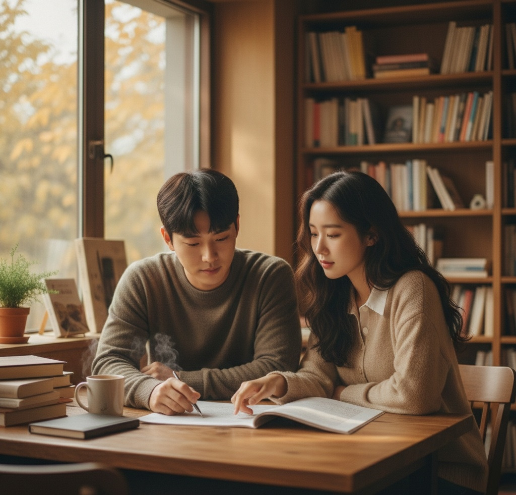 두 사람은 오래된 책방 구석에 앉아