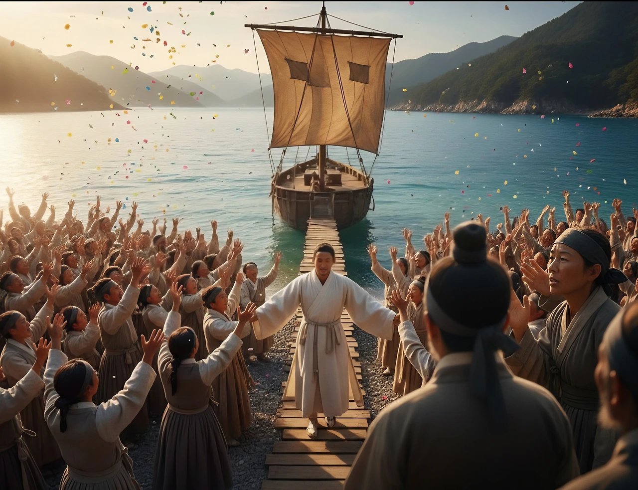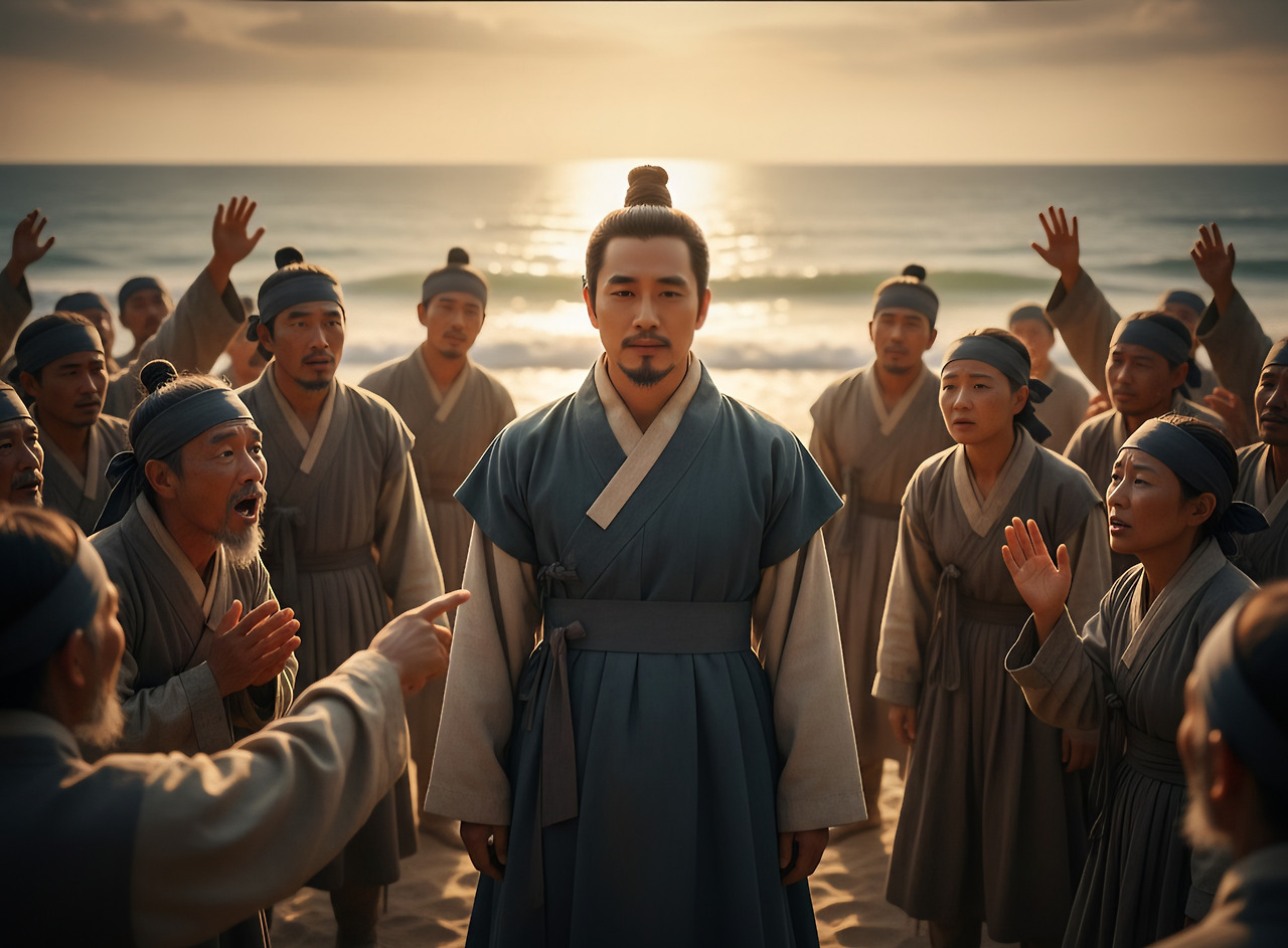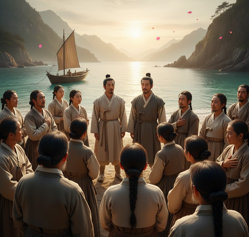 부루는 배에서 내려 백성들 한 사람 한 사람을 눈에 담았다. 지난 시간 동안 그들의 염려와 기다림이 얼마나 컸을지, 그의 가슴에 고스란히 전해졌다. 그의 얼굴에는 봉래에서의 깨달음으로 인한 평온함과, 동시에 백성들에 대한 깊은 사랑과 책임감이 서려 있었다.