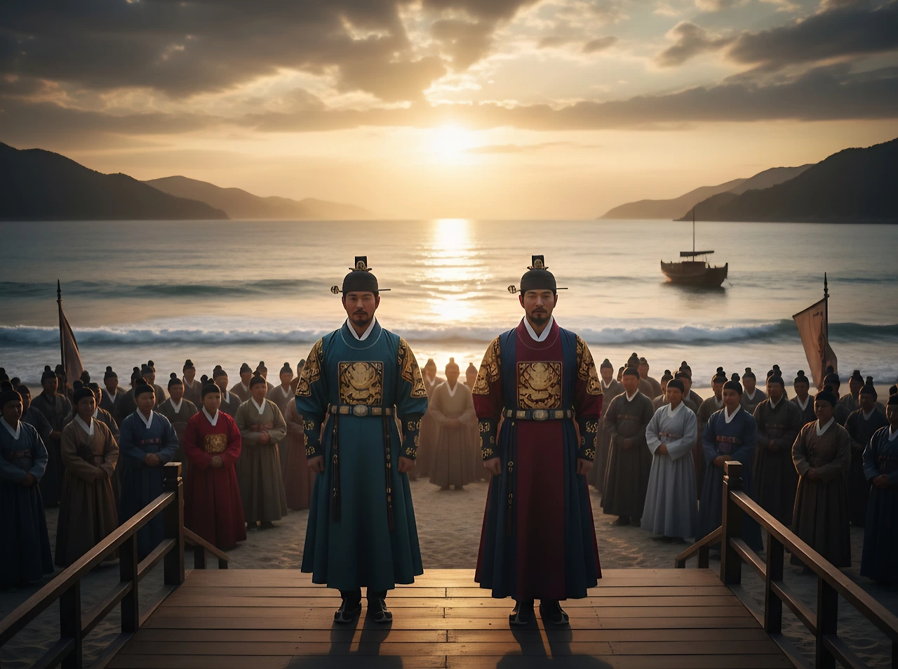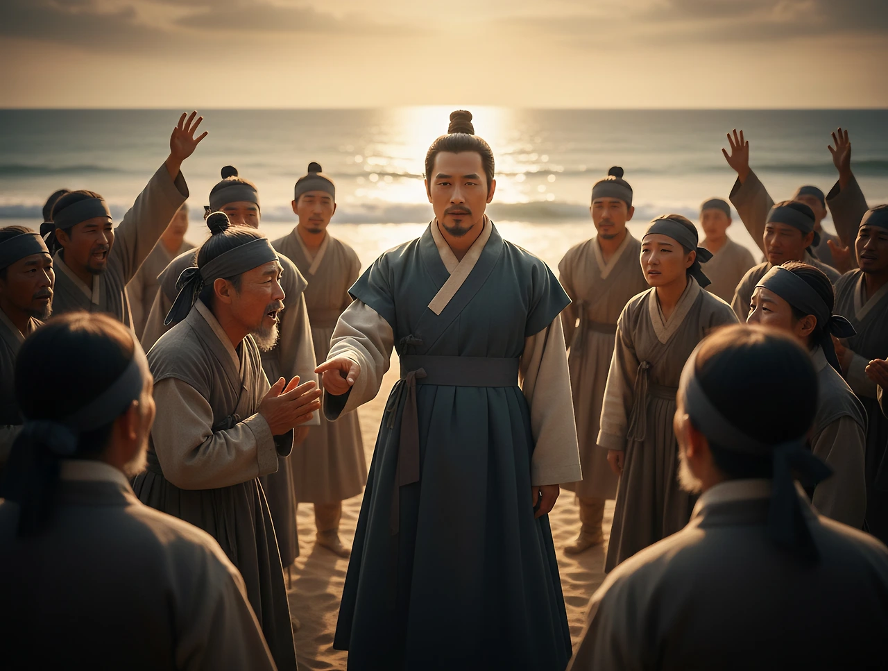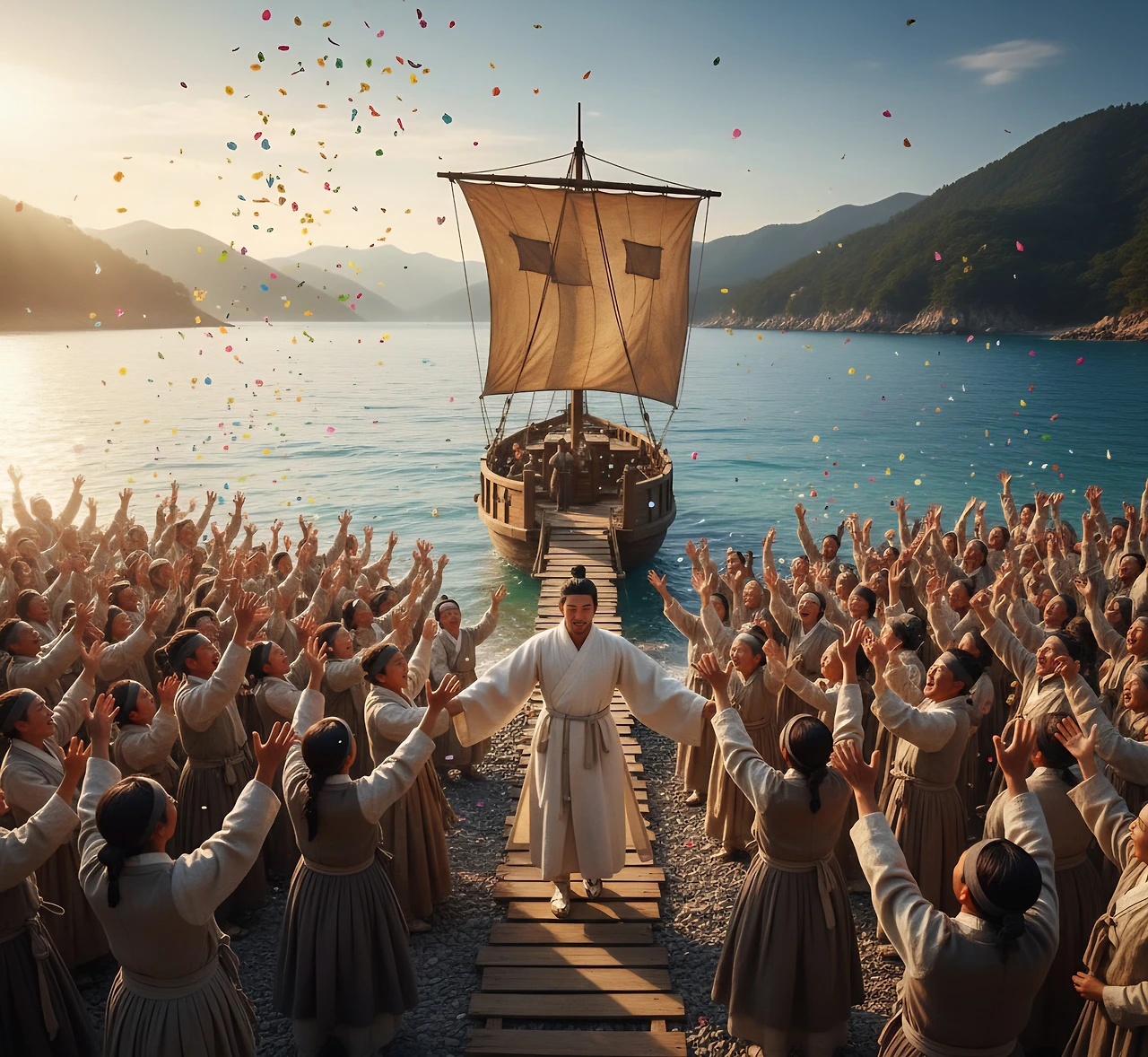 부루는 배에서 내려 백성들 한 사람 한 사람을 눈에 담았다. 지난 시간 동안 그들의 염려와 기다림이 얼마나 컸을지, 그의 가슴에 고스란히 전해졌다. 그의 얼굴에는 봉래에서의 깨달음으로 인한 평온함과, 동시에 백성들에 대한 깊은 사랑과 책임감이 서려 있었다.
