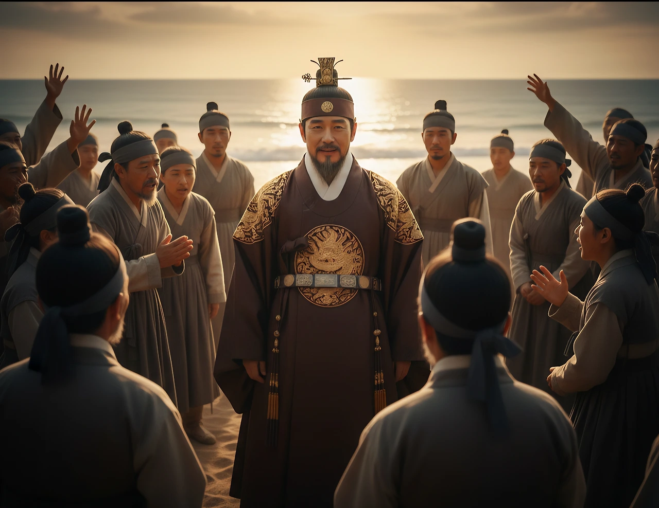 바로 그때, 단군왕검이 조용히 앞으로 나섰다. 그는 환호와 실망이 교차하는 백성들과 동요하는 신하들을 한 번에 아우르는 위엄 있는 시선으로 모두를 바라보았다.