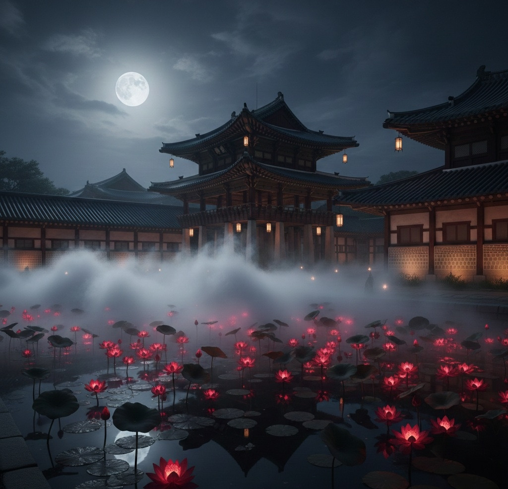 북부 부여의 왕궁, 그날은 하늘마저 숨죽인 듯 고요했다. 만월이 휘영청 밝았으나, 궁궐 연못 위로는 기묘한 안개가 자욱하게 피어올라 마치 세상을 가릴 듯했다. 연못가의 연꽃들은 그 어느 때보다 붉은빛을 토하며 피어났고, 그 강렬한 색채는 다가올 운명을 예고하는 듯했다.