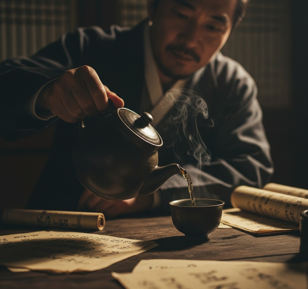 방 한가운데 앉아 차를 우리 던 조병수가 냉소적인 미소를 지으며 백정치를 맞았다. 그의 목소리는 나직했지만, 그 안에는 칼날 같은 차가움이 숨어 있었다. 백정치는 고개를 숙인 채 방 안으로 들어섰다. 퀴퀴한 흙냄새와 오래된 나무 냄새가 뒤섞인 사랑방 공기가 그를 짓누르는 듯했다.