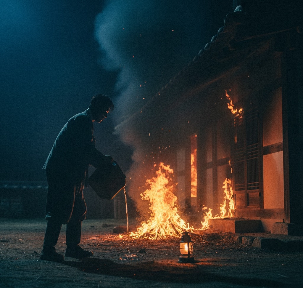 화재 당일 밤, 칠흑 같은 어둠 속에서 누군가가 학당에 몰래 잠입했다. 석유를 뿌리고 불을 질렀다.