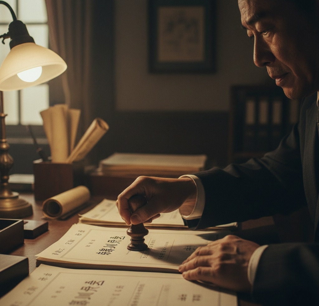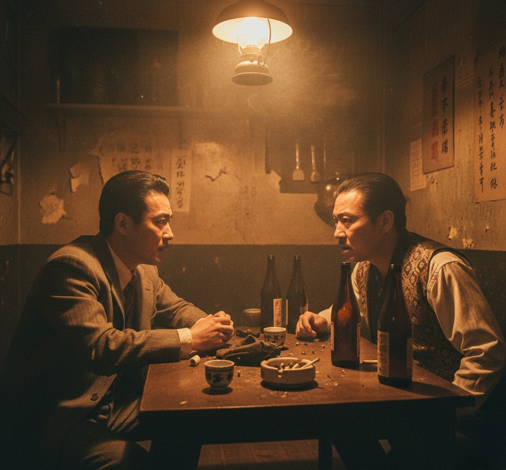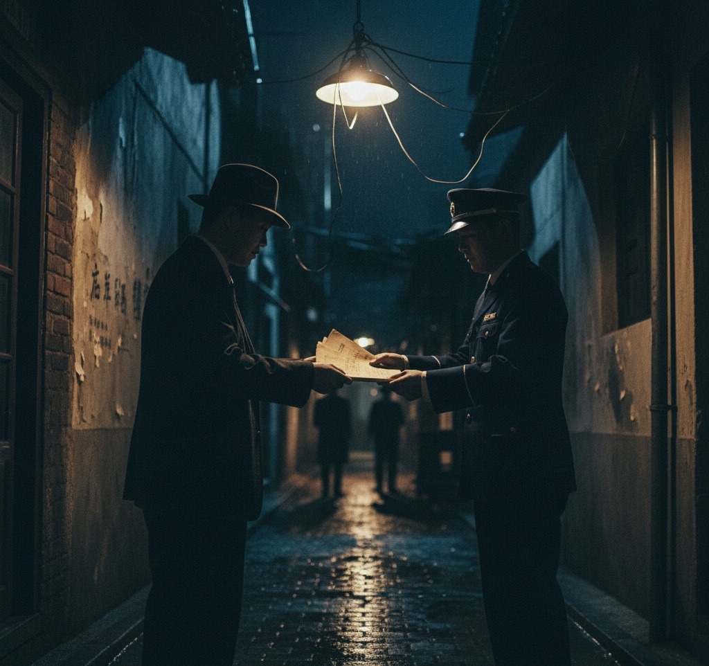 “비밀스러운 뒷골목, 서류를 일본 순사에게 건네는 장면, 그림자 대비 강조, 무거운 분위기”