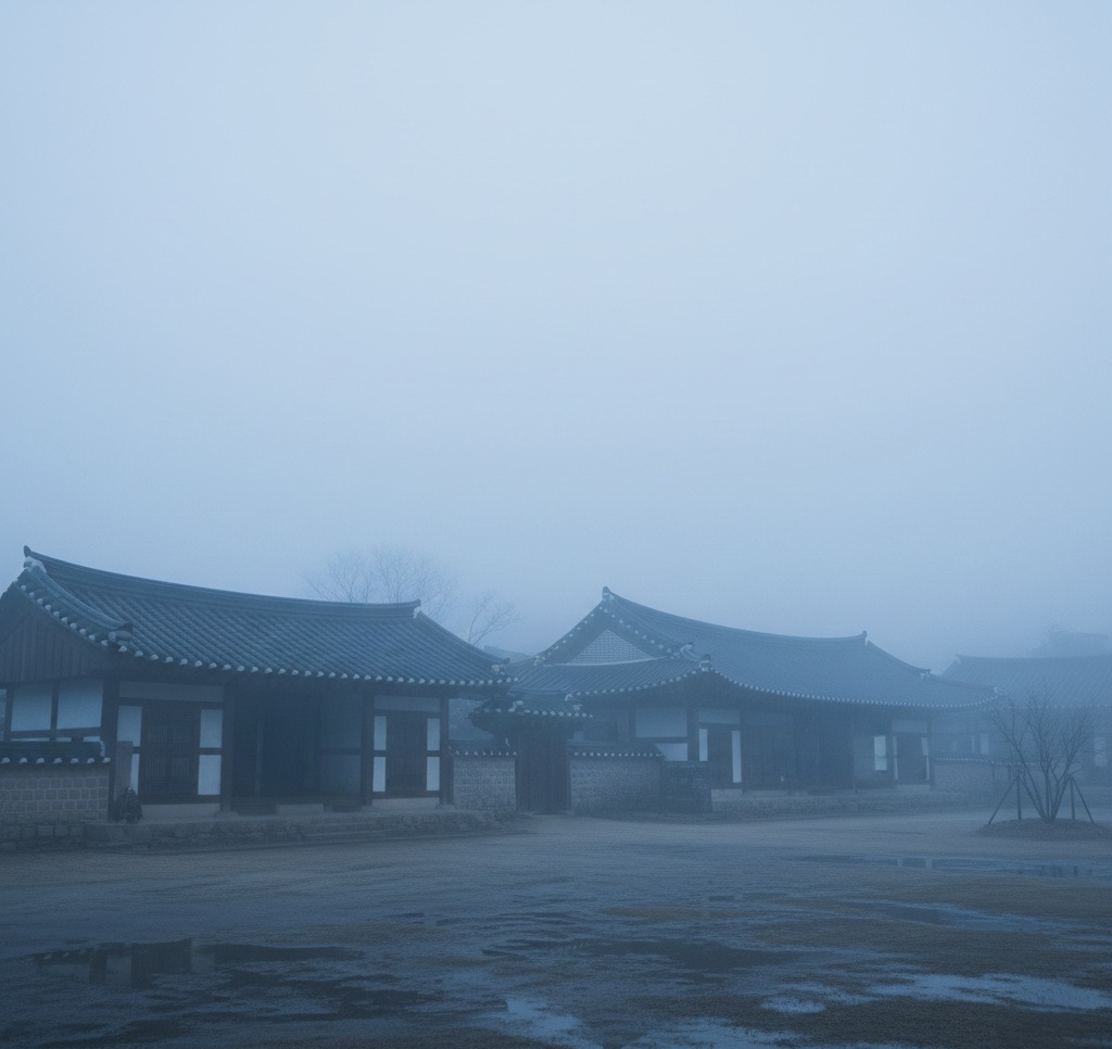 새벽녘, 안개가 마을을 감싸고 있었다. 희뿌연 물결이 논둑을 지나 사랑채의 처마 끝을 스치고, 대지 위에 남겨진 짙은 침묵은 아무도 깨지 못한 채 고여 있었다.