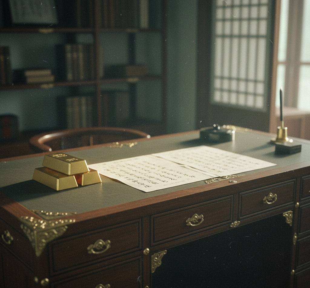 사랑채 안, 황동 장식의 재단장된 책상 위에는 일본어로 된 문서와 금괴 몇 개, 그리고 새로 도착한 관보가 놓여 있었다.