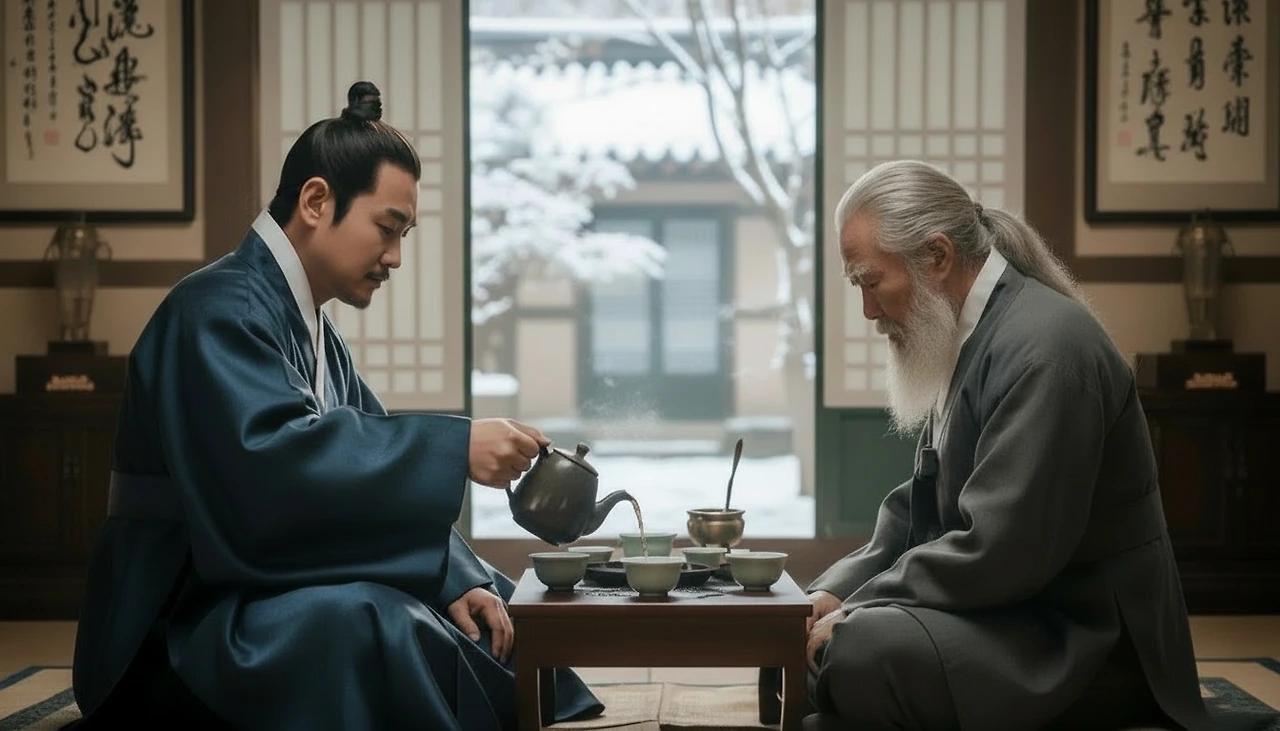 이산갑은 강무일 앞에 앉아 있었고, 마루 사이로 가을바람이 은은히 스며들었다.