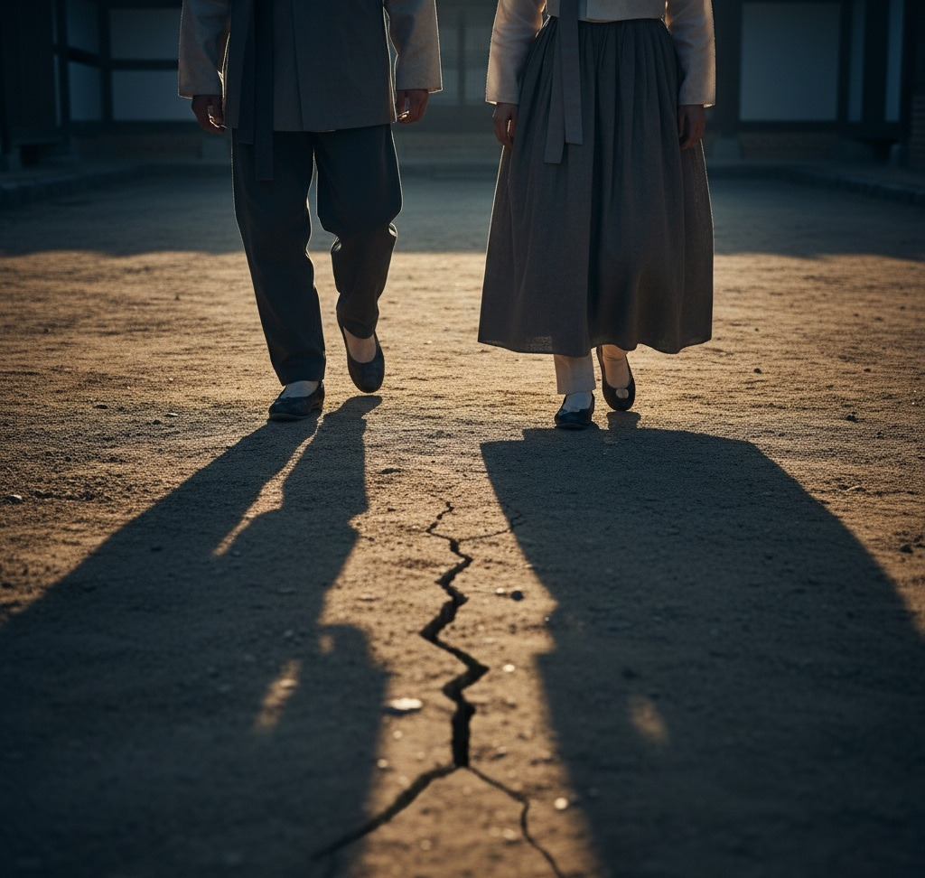 이산갑은 손끝이 떨리는 것을 스스로도 느꼈다. 방 안에서 그가 다가섰던 것은 허락이었지만, 마당에서는 책임이, 그리고 시대라는 벽이 두 사람 사이에 거대한 그림자처럼 버티고 있었다.