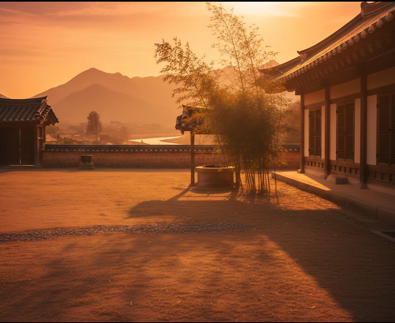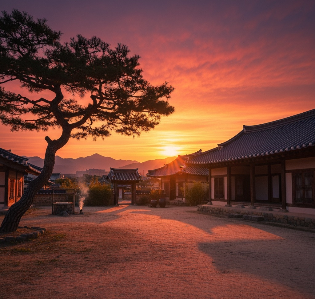 노송의 그림자가 길게 드리워지고, 기와지붕의 윤곽은 금빛 테두리를 두른 듯 서늘하게 빛났다.