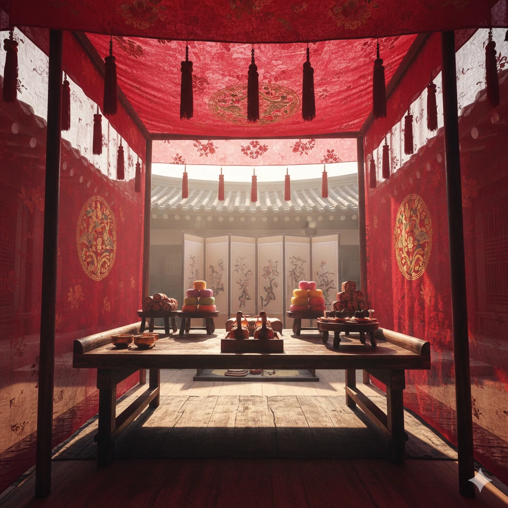 붉은 초례청, 금빛 매듭, 기러기 상, 정갈히 쌓인 떡…