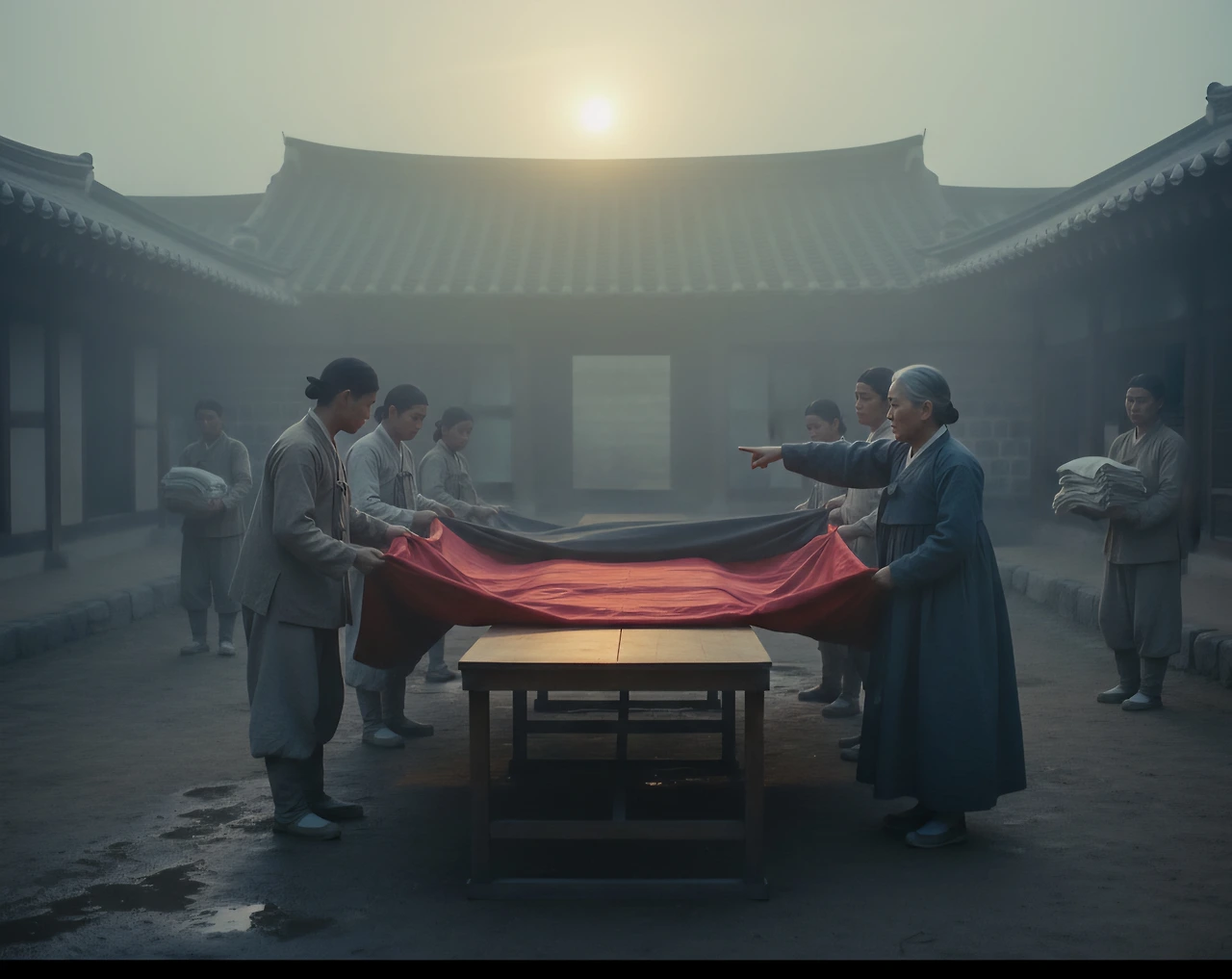 안개가 서늘하게 감돌던 마당 위로 붉은 비단 초례청이 서서히 모습을 드러냈다.