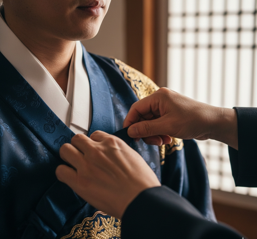 산돌은 (옷깃을 매만지며) "도련님, 오늘 정말 멋지십니다."이산갑: (거울을 보며) "...너무 화려한 것 같은데."