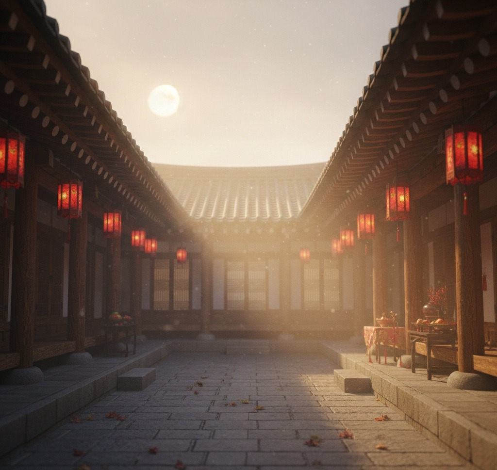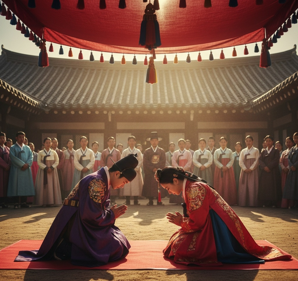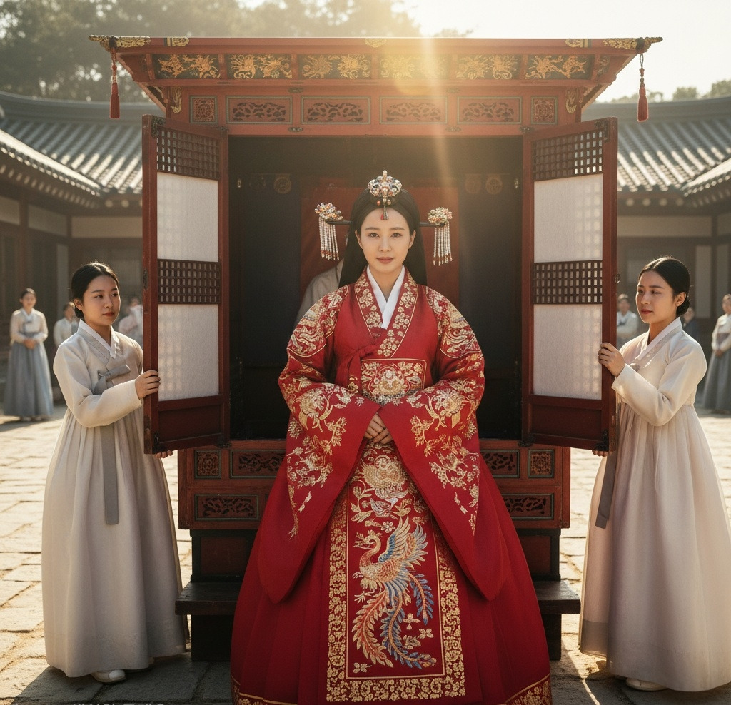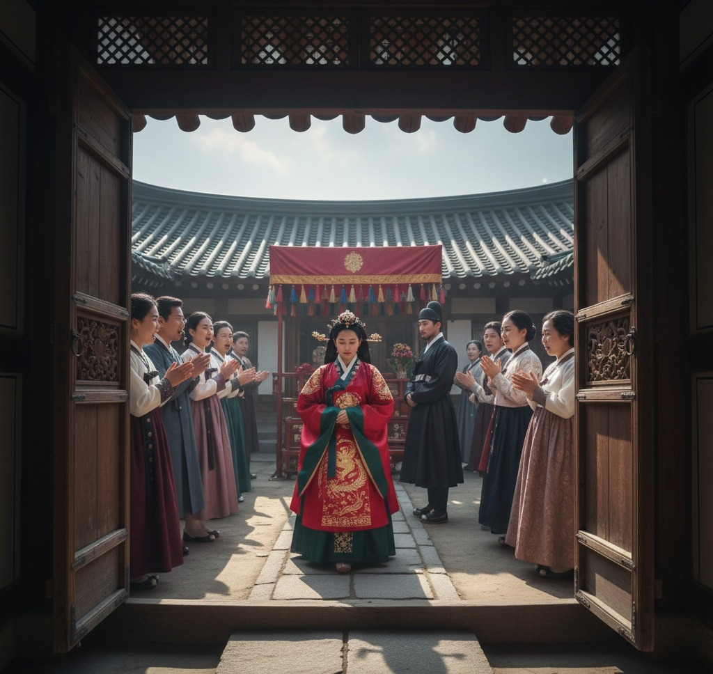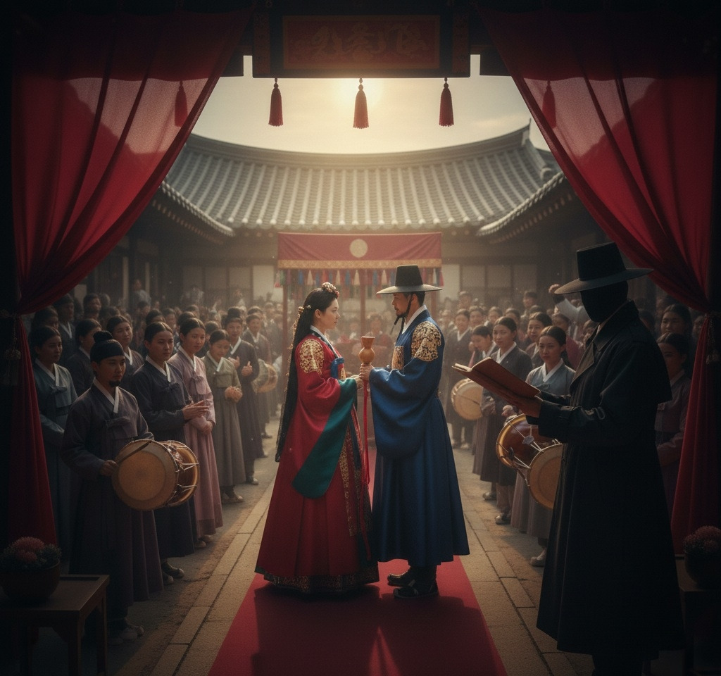 초례청 마당에는 아침부터 붉은 비단 천이 드리워져 있었다. 일제강점기의 무거운 공기 아래에서도, 오늘만큼은 마치 세상이 정지한 듯했다. 사랑채와 안채를 잇는 돌계단 위로 볕이 내려앉고, 한옥의 흰 기둥과 예스러운 목재 결은 은은하게 빛났다.