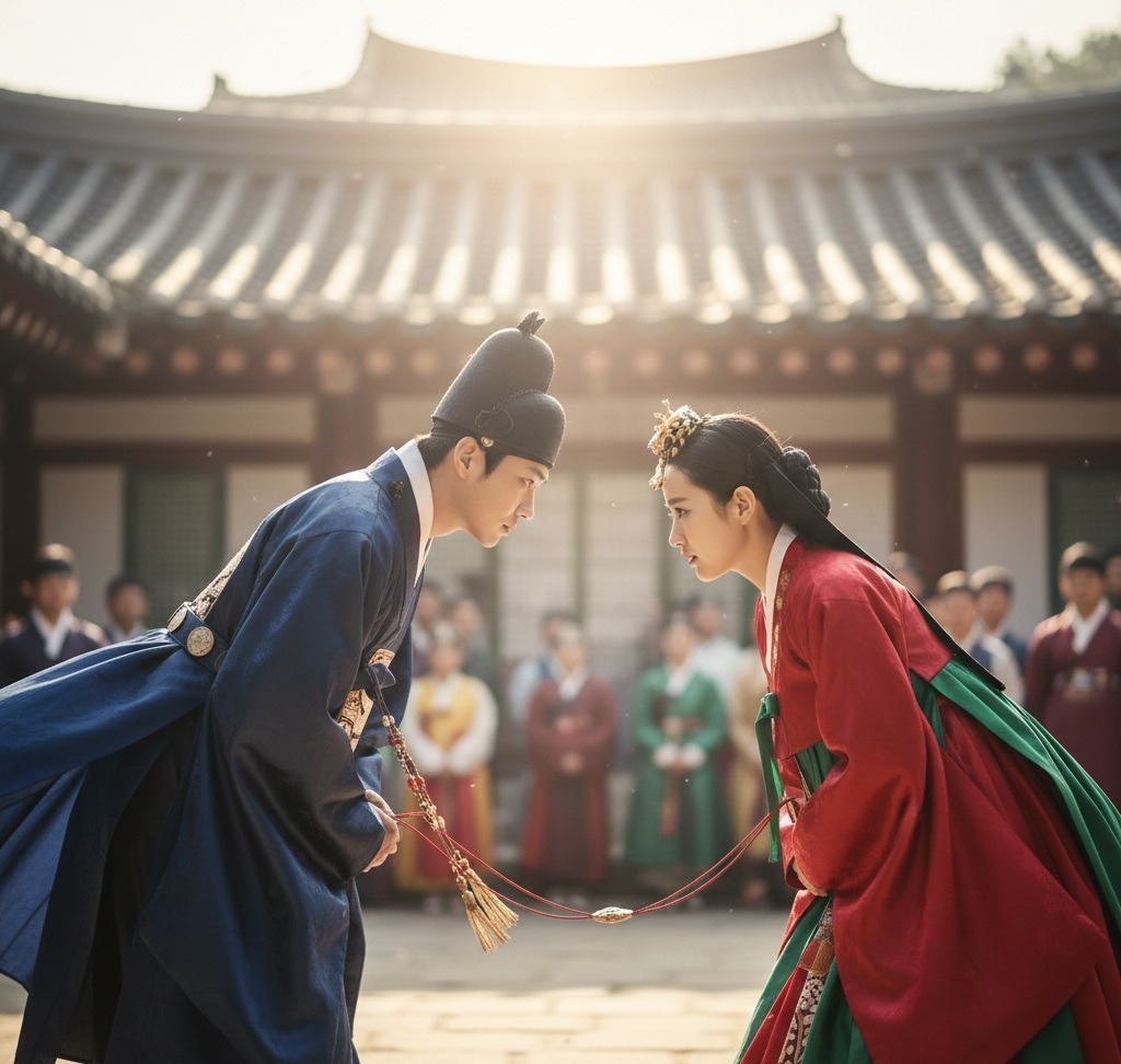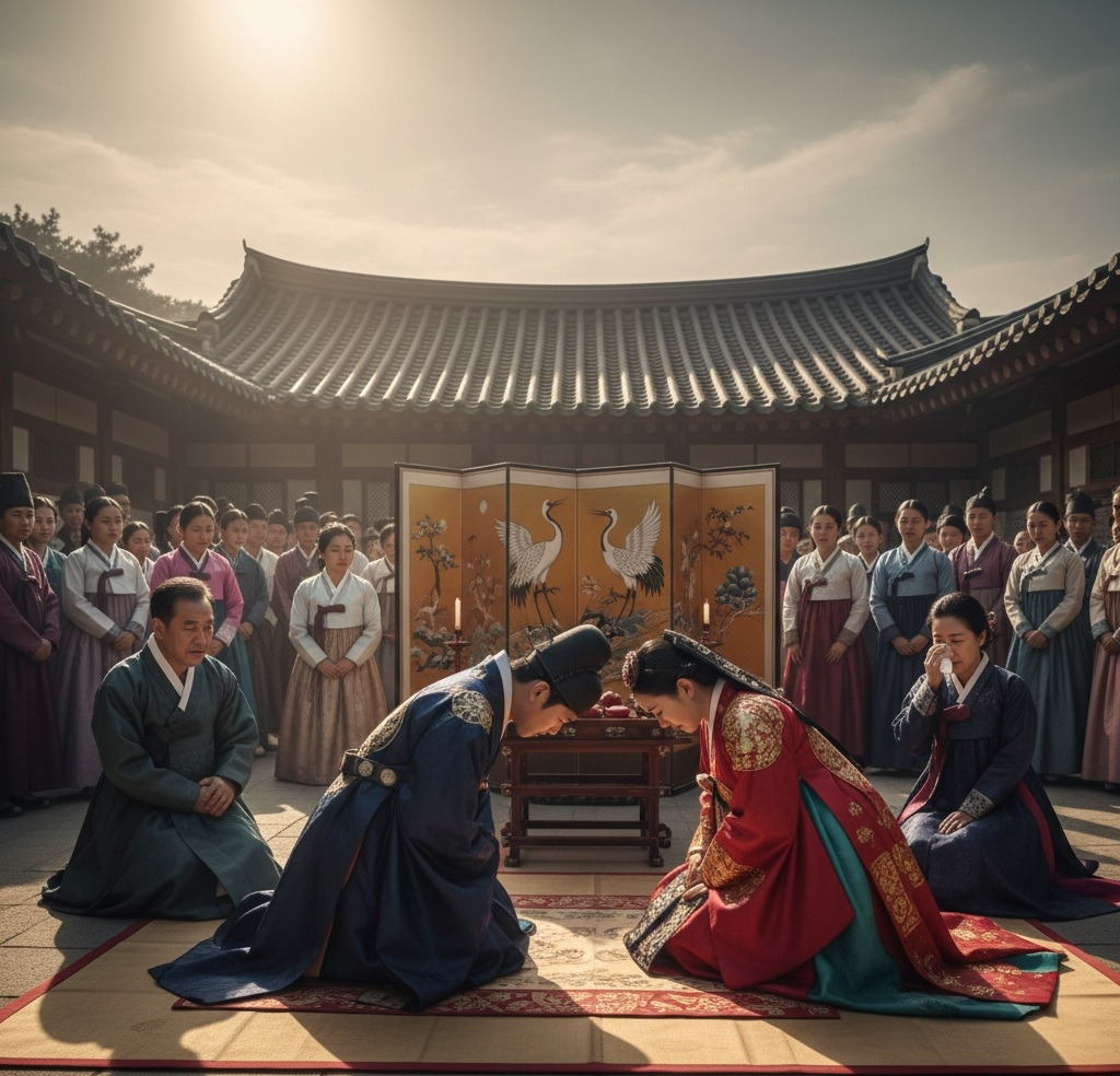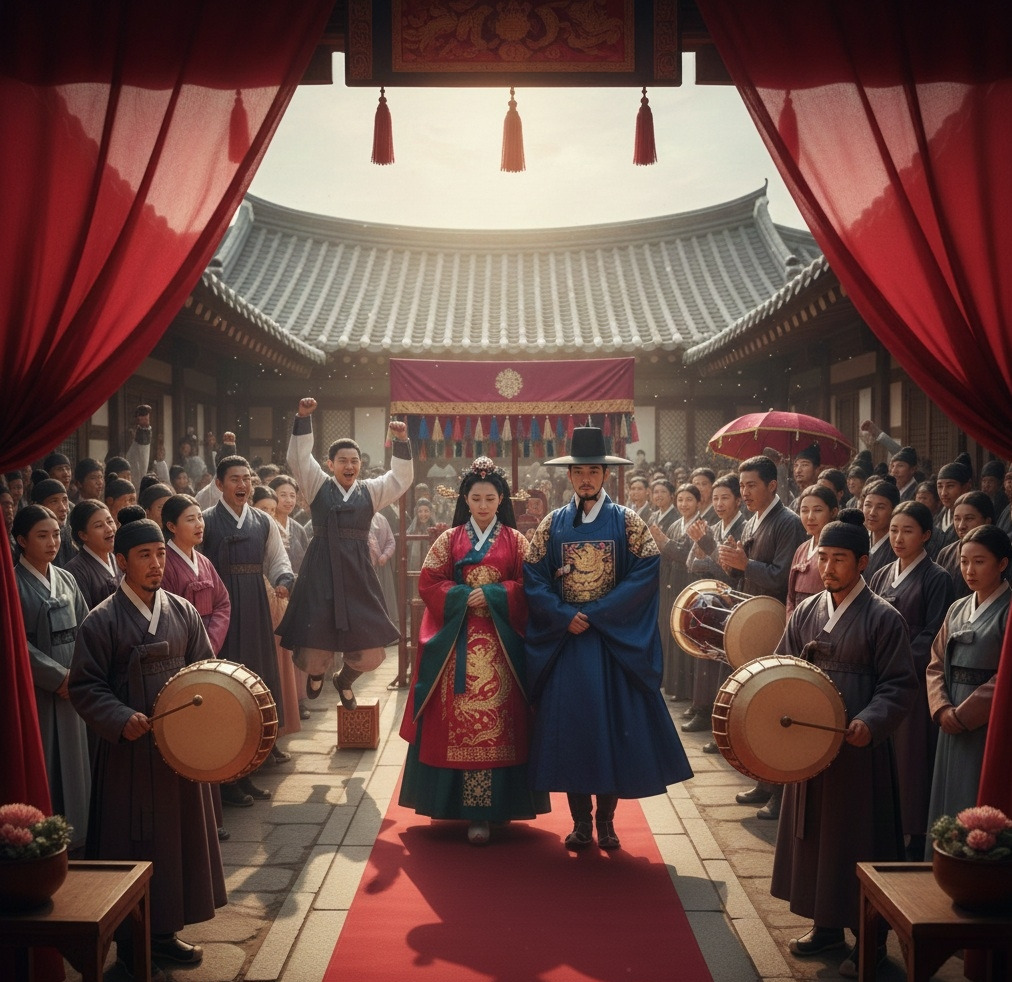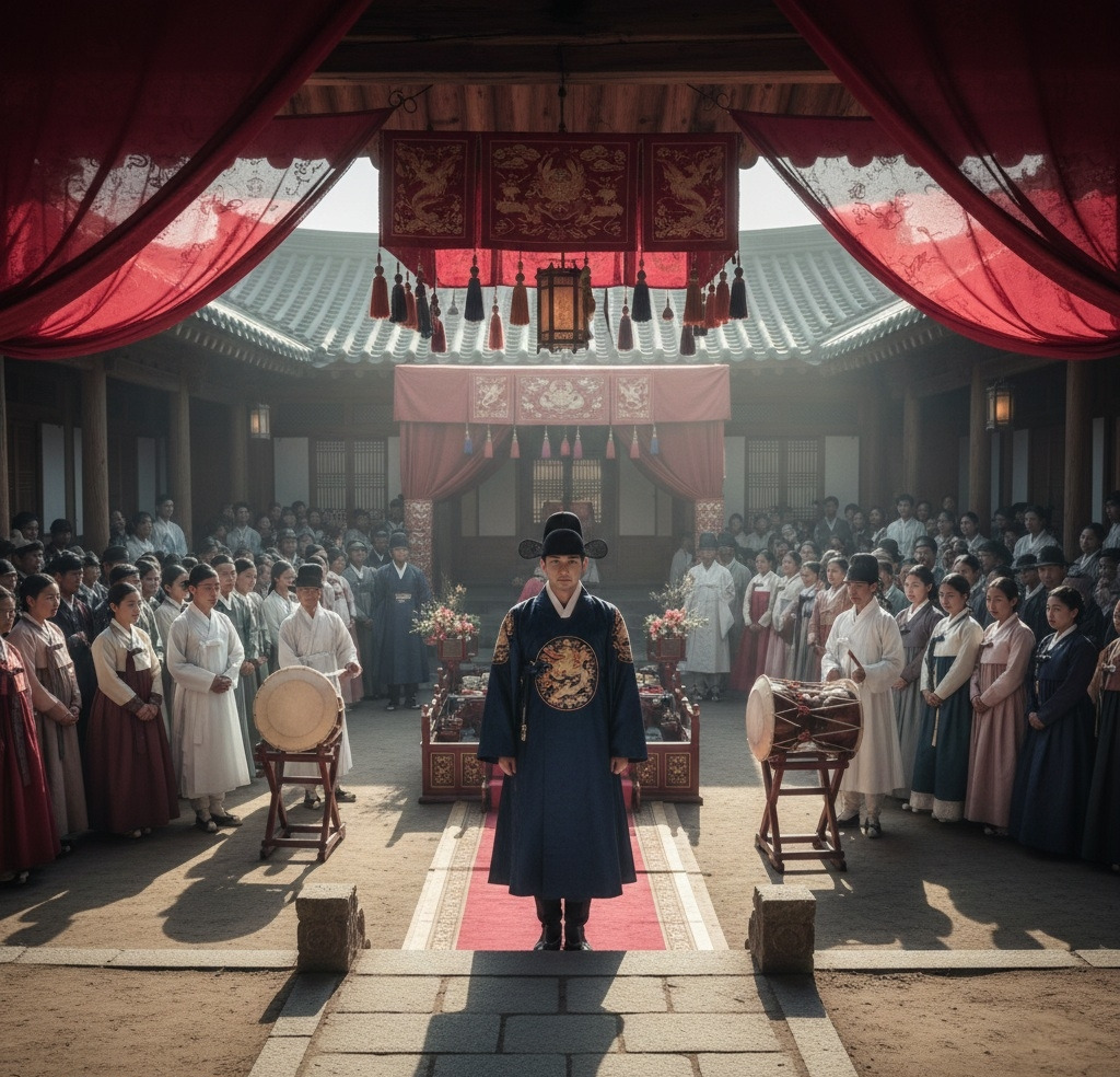 초례청 마당에는 아침부터 붉은 비단 천이 드리워져 있었다. 일제강점기의 무거운 공기 아래에서도, 오늘만큼은 마치 세상이 정지한 듯했다. 사랑채와 안채를 잇는 돌계단 위로 볕이 내려앉고, 한옥의 흰 기둥과 예스러운 목재 결은 은은하게 빛났다.