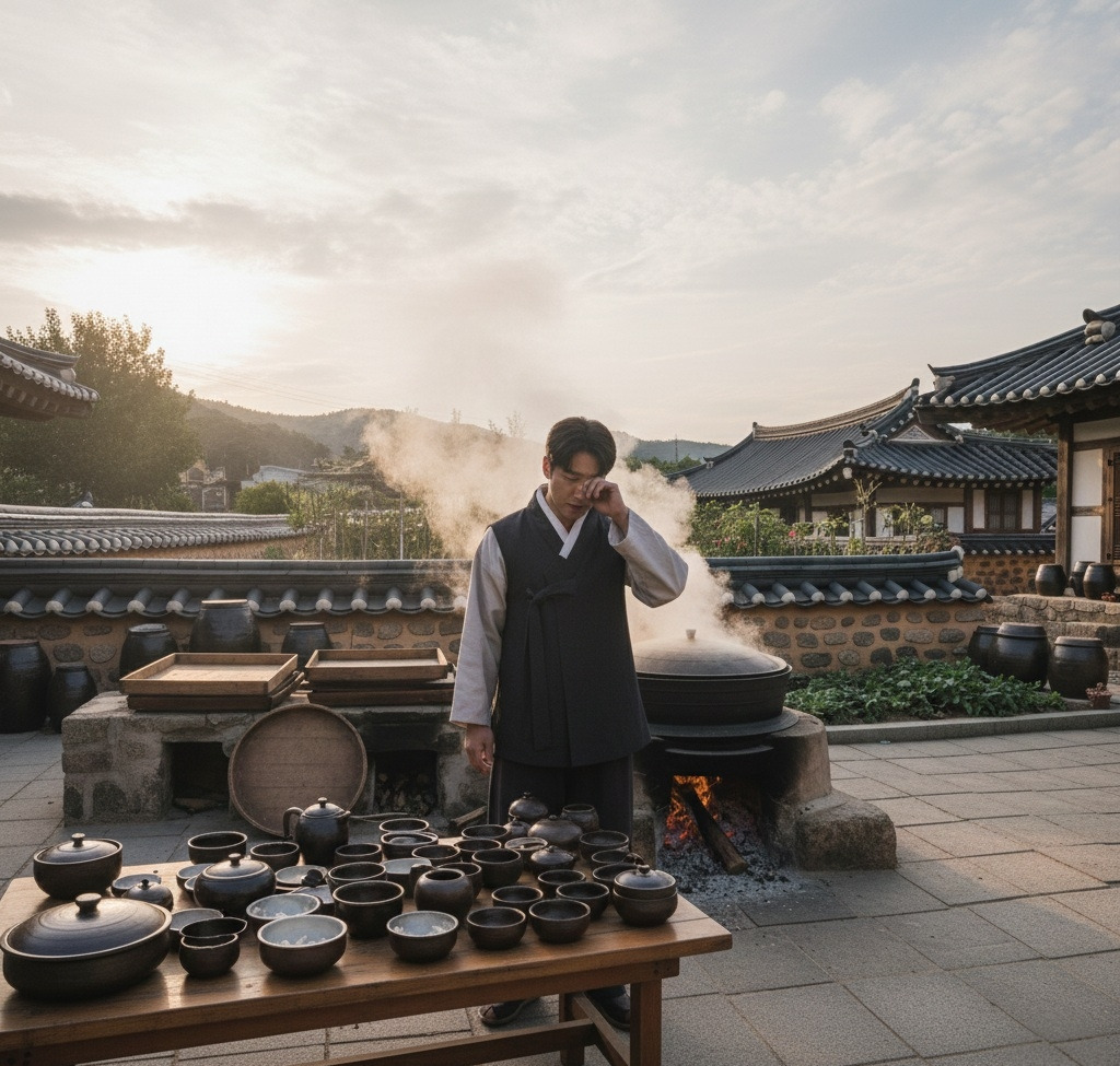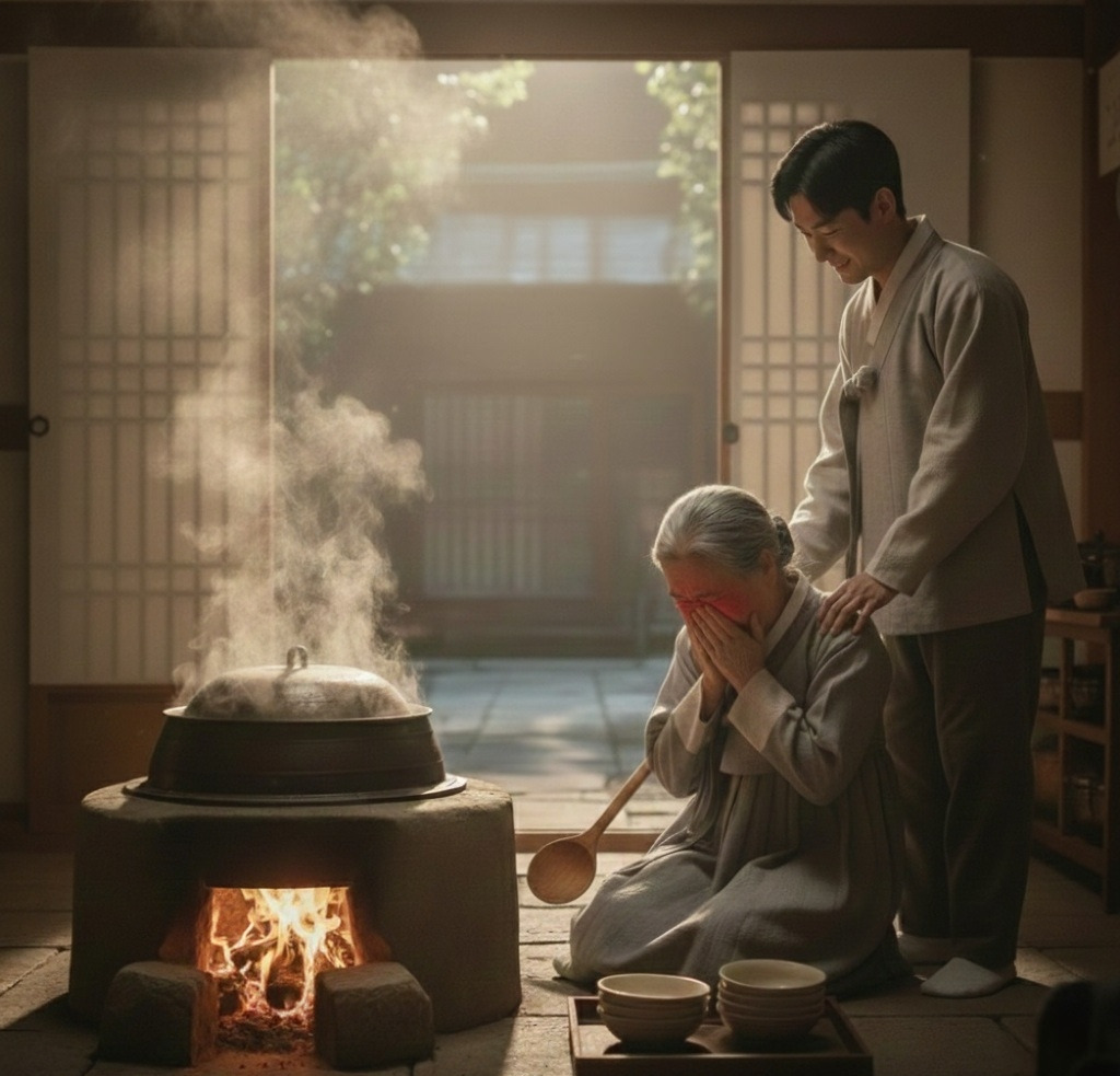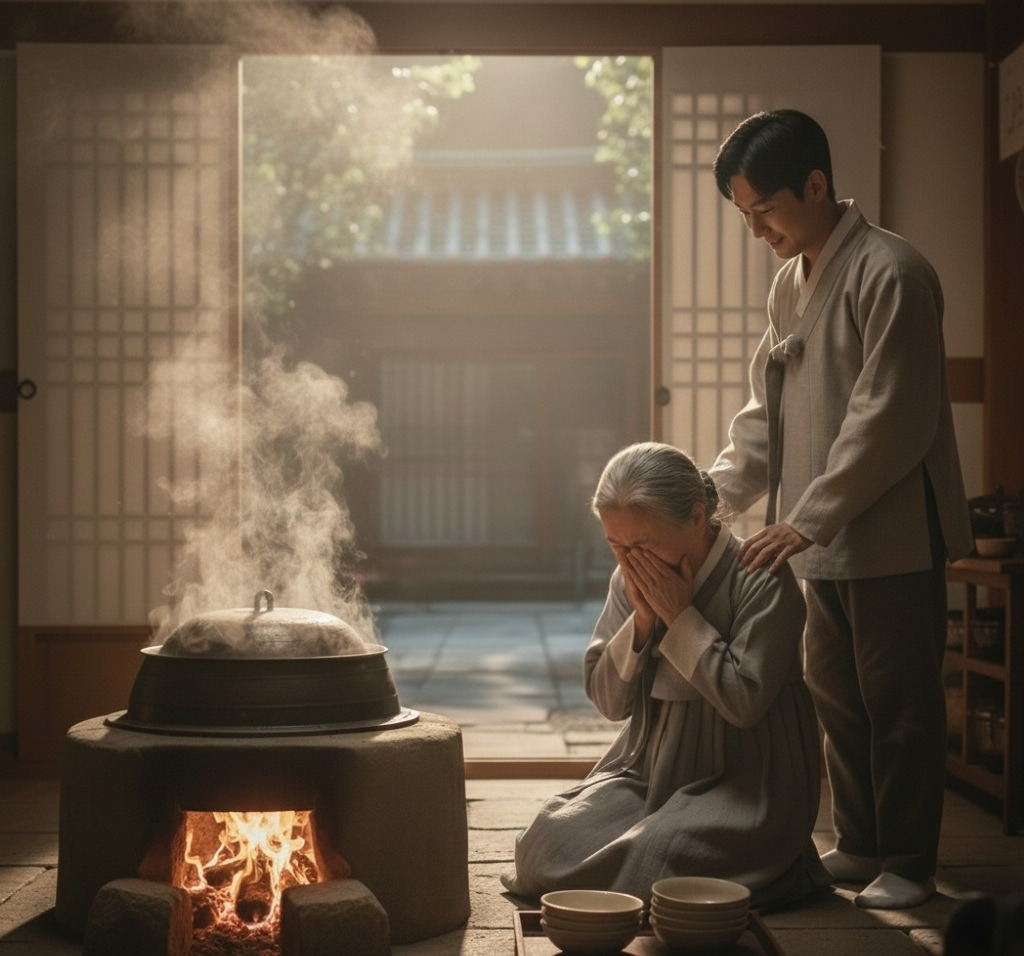 사랑채에서 들려오는 웃음소리, 마당에 가득한 덕담과 축하의 말들, 그리고 처마 끝으로 흘러내리는 석양빛이 부엌 안까지 살랑거리며 스며들었다.