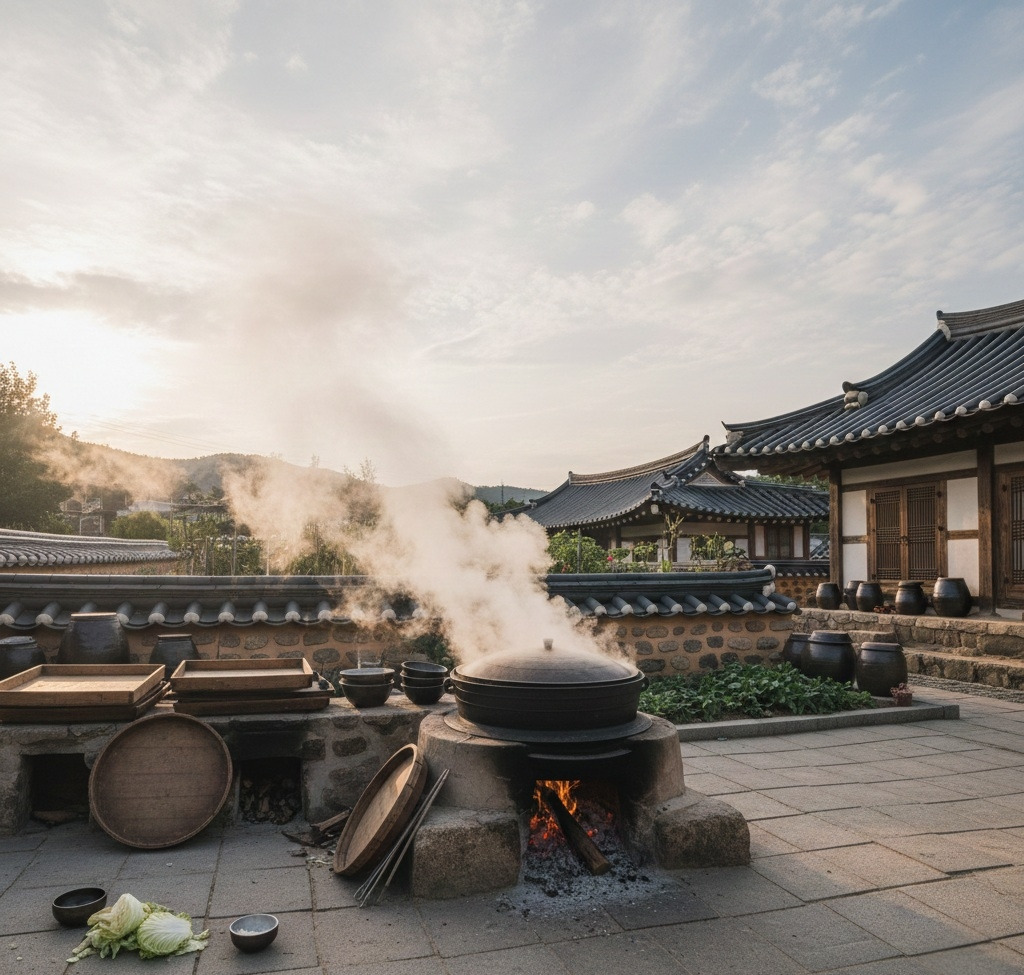 부엌 뒤편에서는 커다란 솥에서 김이 피어올라 천천히 하늘로 흩어지고 있었다.