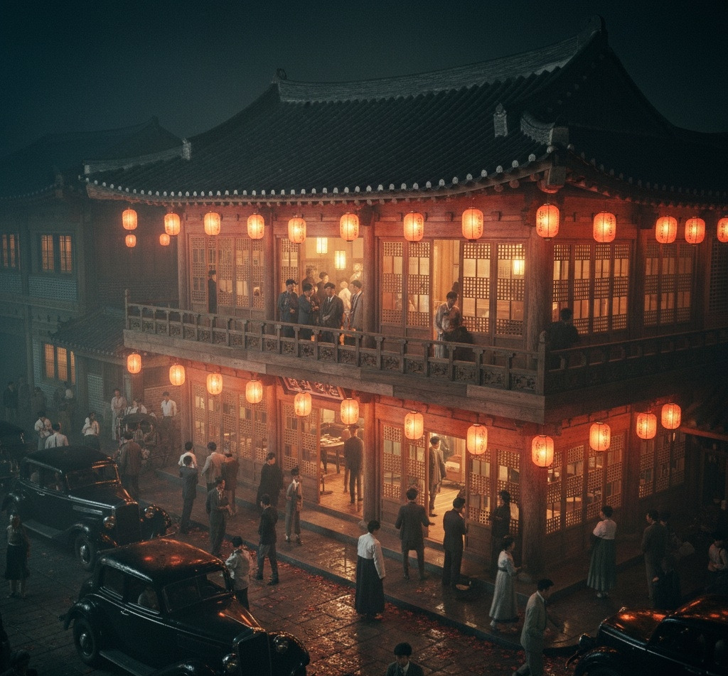 1934년 가을, 광주 충장로의 밤은 짙은 조명 아래 몽환적인 빛을 띠고 있었다. 번화한 거리의 한복판, 2층 한옥 건물 '진주관(珍珠館)'은 그 이름처럼 화려한 자태를 뽐내며 손님들을 유혹했다. 붉은 등롱 아래 은은하게 비치는 창호지 문 너머로는 기생들의 노랫가락과 흥청거리는 손님들의 웃음소리가 끊이지 않았다. 겉으로 보기엔 교양 있는 요정 주인이지만, 그 이면에는 서늘한 칼날이 숨겨져 있는 곳. 진주관은 광주의 밤을 지배하는 또 다른 세계의 심장이었다.