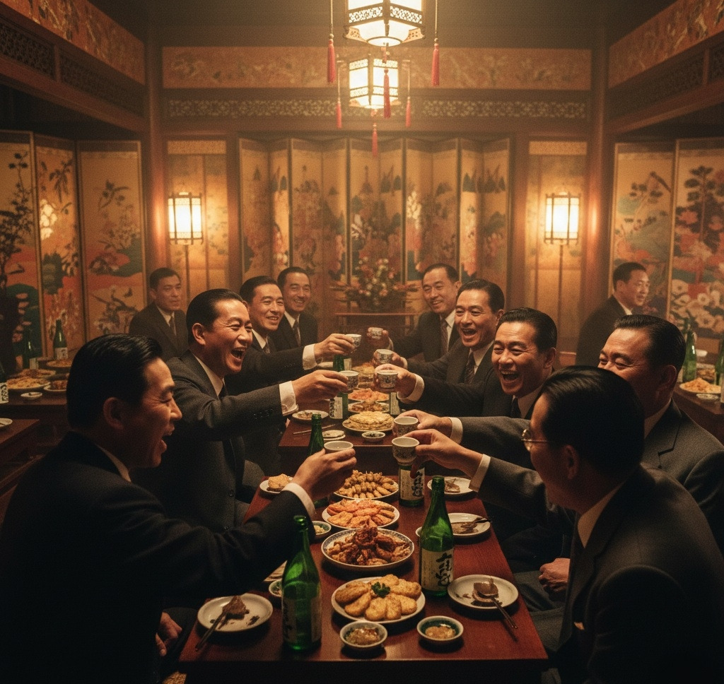 일본인 고관들은 비단으로 둘러싸인 넓은 좌식 테이블 앞에서 얼굴을 붉히며 웃음을 터뜨렸다.