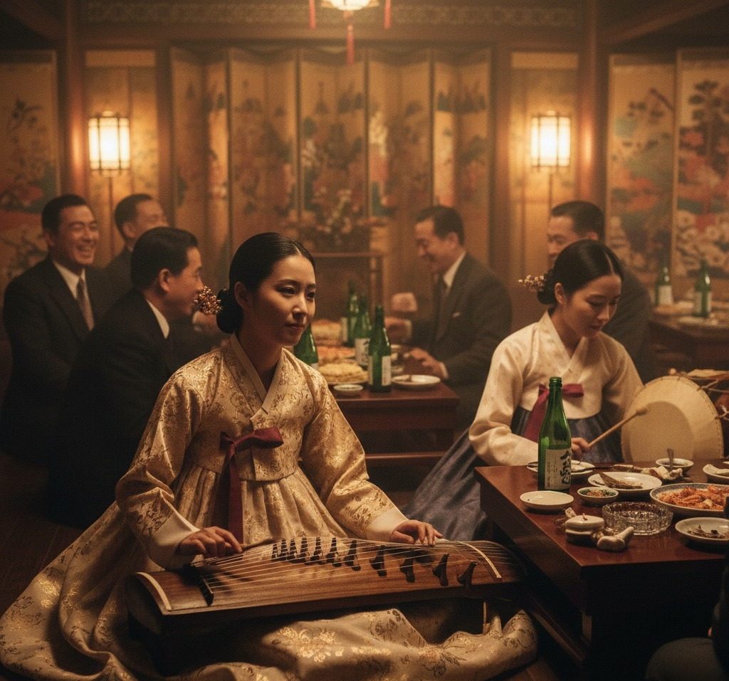 술잔이 부딪히는 소리, 비파 줄을 튕기는 손끝, 기생들의 웃음이 한데 섞여 요란한 밤이 이어졌다.