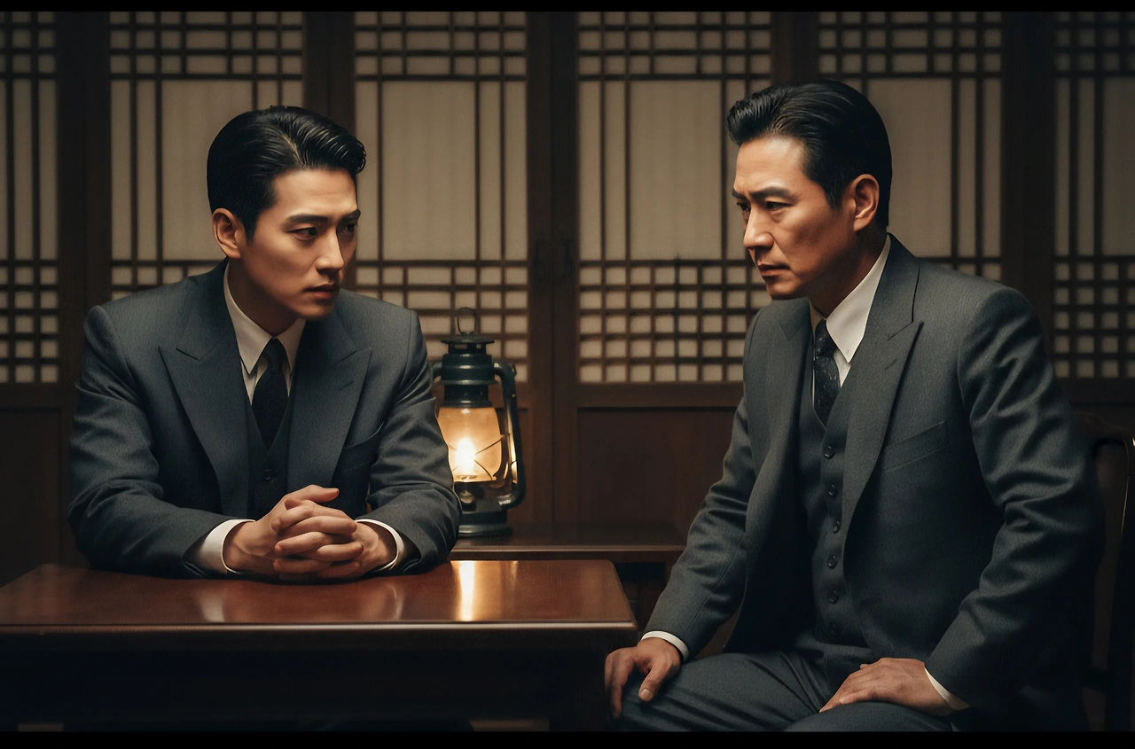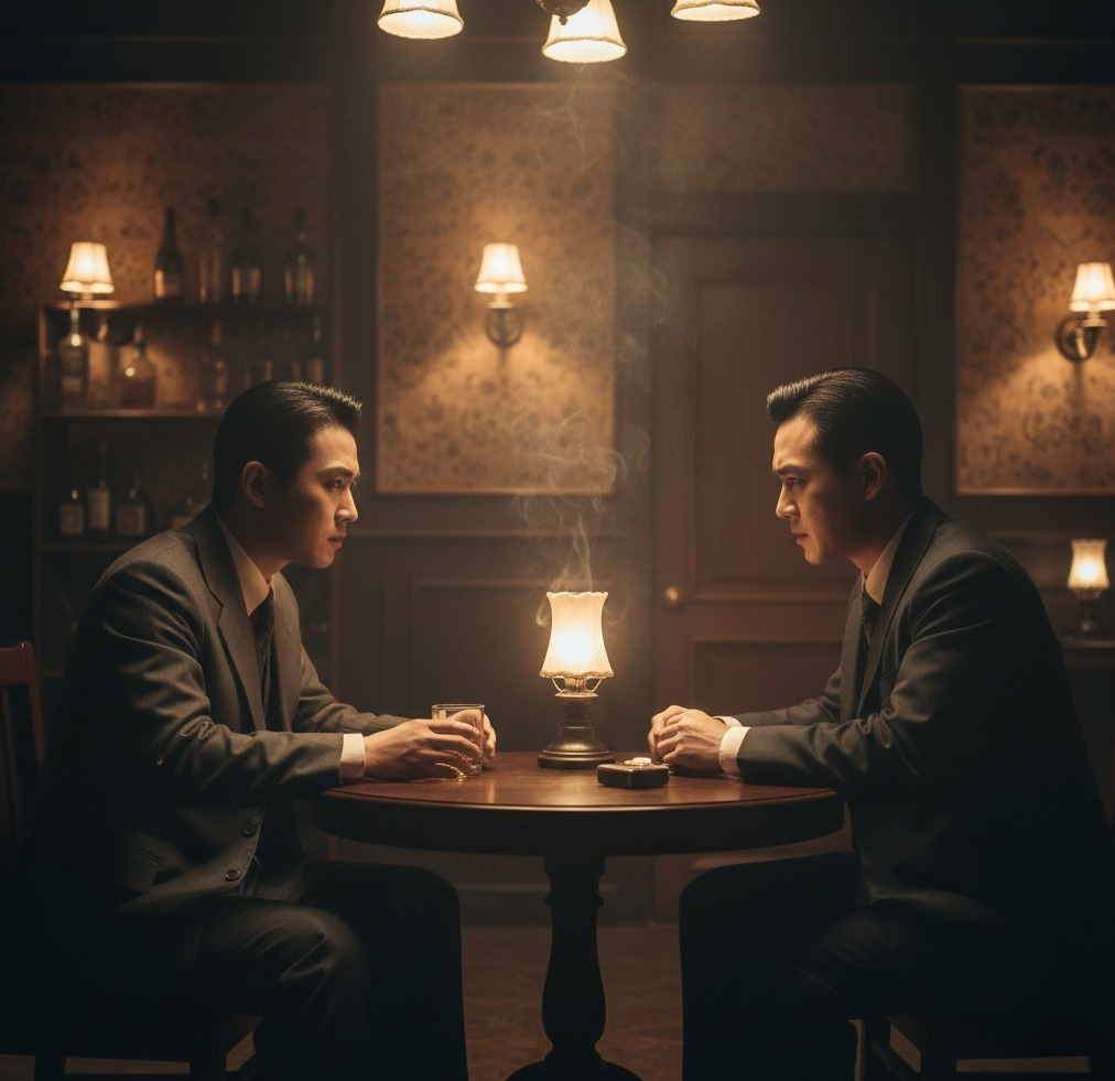 2층 귀빈실은 여전히 조용했다. 건물 아래층에서는 축배와 음악이 뒤섞여 흐르고 있었지만, 이 층에 올라오면 소리는 마치 지하에 묻혀버린 유령처럼 희미한 울림으로만 남았다. 바람 한 줄기조차 스산하게 스며드는 적막—그 적막 속에서, 두 남자는 서로를 향해 앉아 있었다.