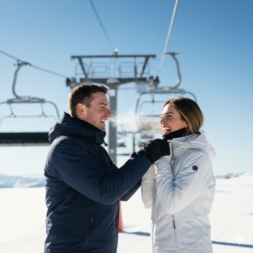 리프트에 앉아 손을 잡고