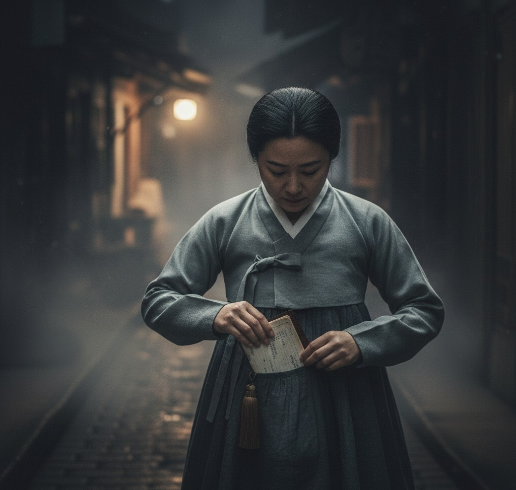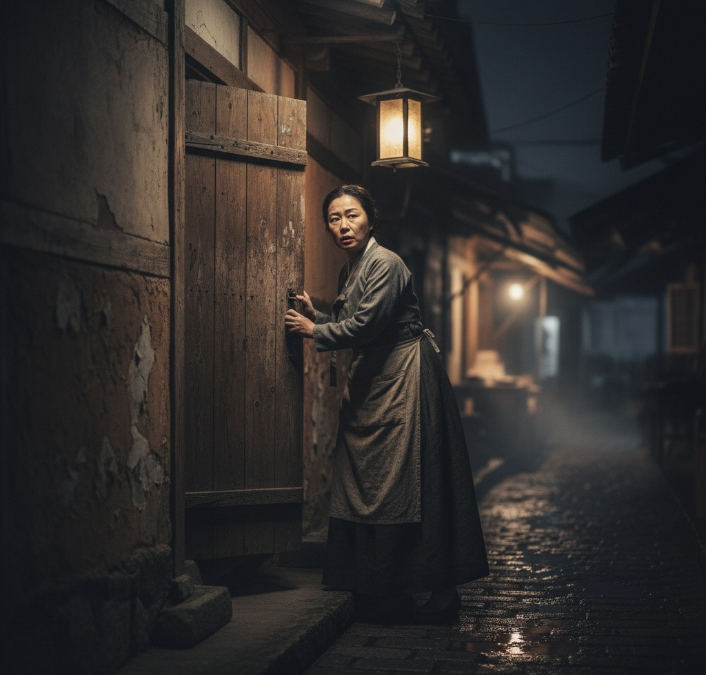 그녀는 천천히 뒷문을 닫고, 아무도 모르게 다시 어둠 속으로 걸어 들어갔다.
