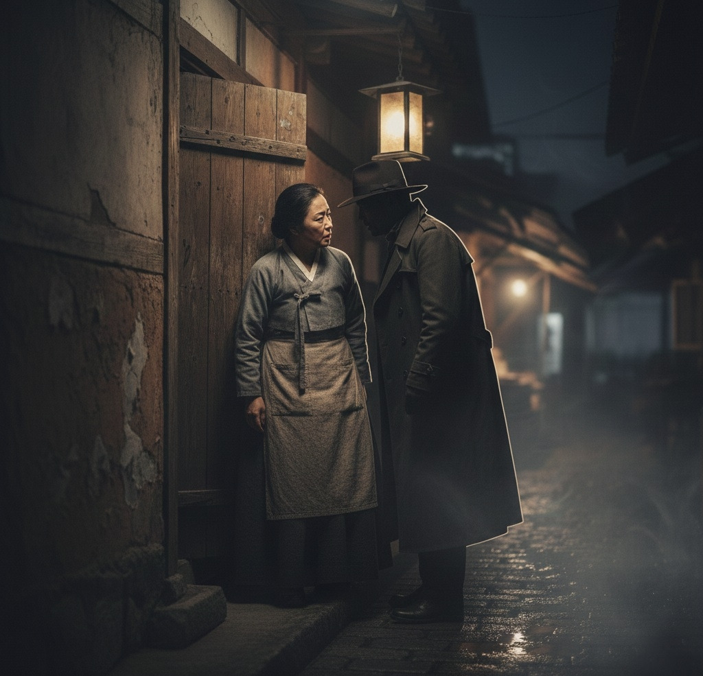 진주관의 문이 닫힌 후, 골목은 삽시간에 고요해졌다. 낮 동안 웃음소리가 넘쳐나던 요정은, 밤이 되면 전혀 다른 얼굴을 드러냈다. 환락의 전등이 꺼지자, 뒷문 주변에는 오래된 돌담과 축축한 흙냄새만이 남았다. 모퉁이에 달린 작은 등불 하나가 바람에 흔들리며 가느다란 빛을 흘렸다.
