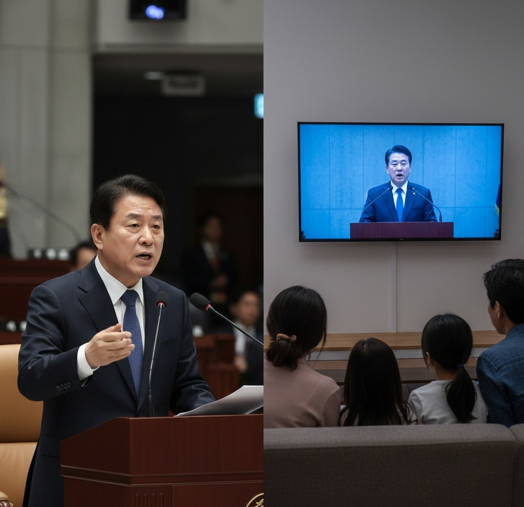 국민들은 텔레비전 속 화려한 연설을 보며 안도한다.
