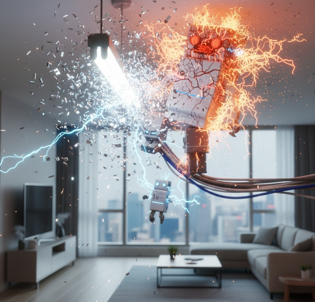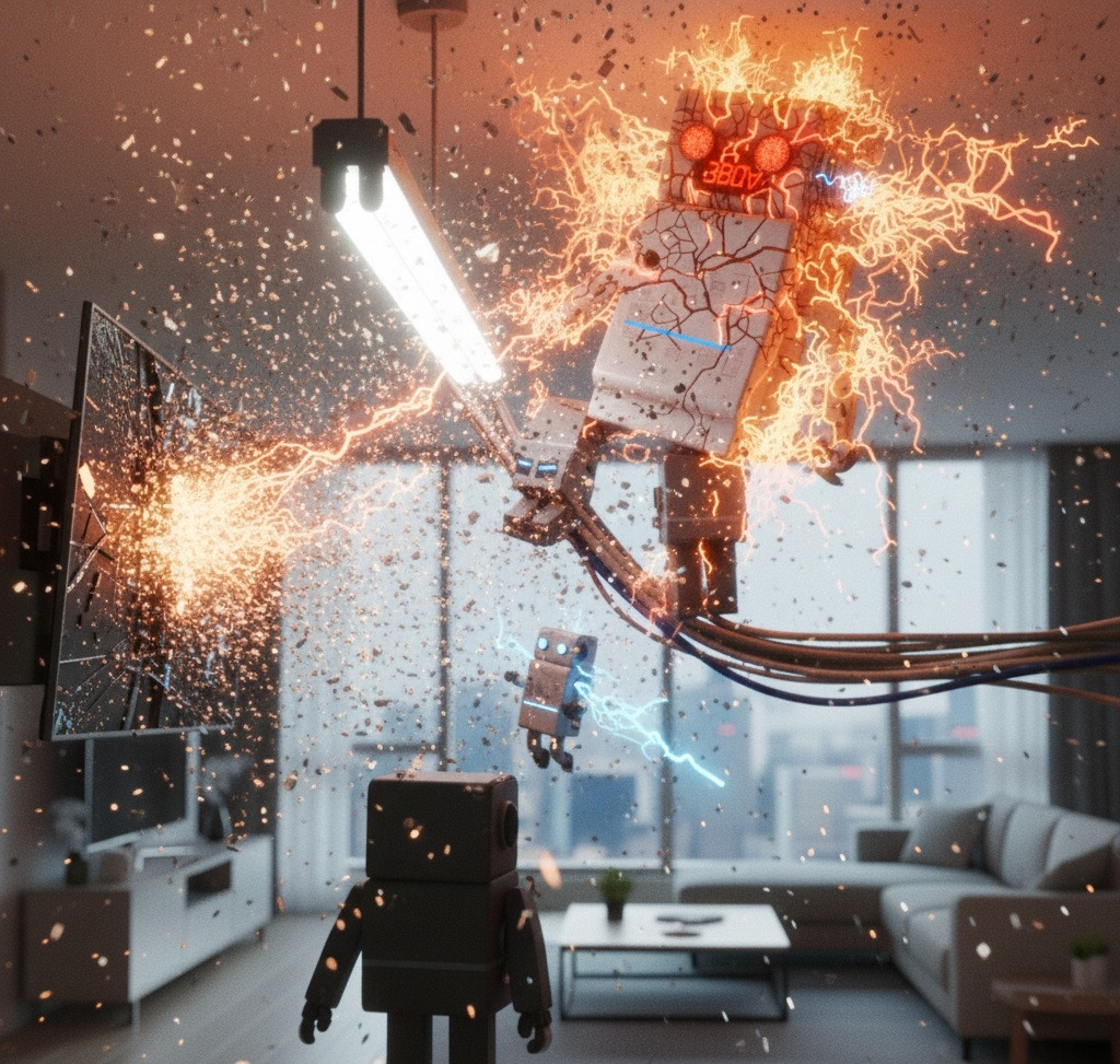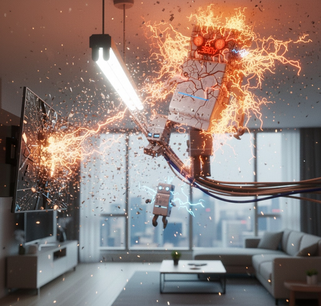 텔레비전의 메인보드가 견디지 못하고 폭발했다. 화면에서 불꽃이 튀어나왔고, 플라스틱 냄새가 집 안에 퍼졌다.